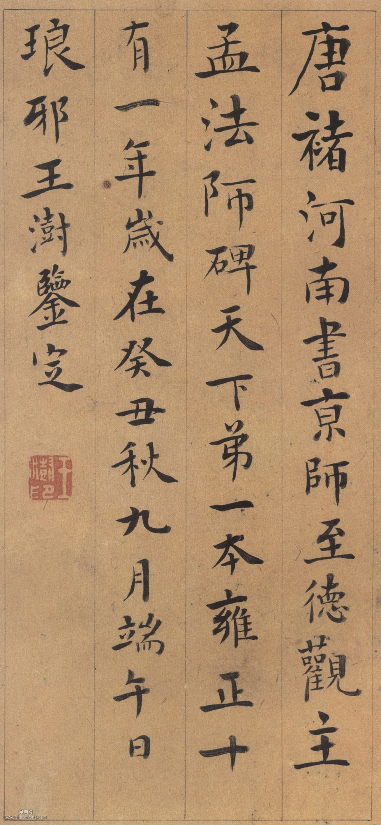 書法欣賞魏晉書法唐朝書法宋朝書法元朝書法明朝書法清朝書法近現代書法字典網>> 歷代書法>> 清朝>> 王澍·跋褚遂良《孟法師碑》正文 王澍·跋褚遂良《孟法師碑》作者:王澍 書體:楷書 王澍跋褚遂良《孟法師碑》,楷書。王澍的相關書法作品:王澍·跋褚遂良《孟法師碑》 王澍草書《臨古法帖》 王澍《篆書漢尚方鏡銘軸》 相關文章:曾熙楷書《漢正衡石五言聯》 (楷書)曾熙《楷書漢正衡石五言聯》紙本楷書 169.2×36.8cm×2 1921年...錢溥·跋褚遂良《倪寬贊》 (楷書)錢溥跋褚遂良《倪寬贊》,縱24.6厘米,台北故宮博物院藏。歐陽詢書法結字36法這篇書論,就是唐代書法大家、楷法極則的創作者——歐陽詢總結出來的《書法結字三十六...王獻之·新婦地黃湯帖 (行草)【釋文】獻之白:思戀,觸事彌至。獻之既欲過餘杭,州將若比還京,必視之。來月十左右...釋擔當·草書五絕詩軸 (草書)【釋文】土滿鋤難劃,牆低砍茨圍。我能存厚道,瓜菜自然肥。擔當。釋擔當《五絕詩軸》...長沙窯詩文壺 《懸釣之魚》題記壺 (行書)行書——青釉褐彩“懸釣之魚”題記壺(局部) 殘高18厘米 底徑11.9厘米 湖...鐵保《行書評東坡錄語軸》 (行書)鐵保《行書評東坡錄語軸》,紙本行書,118×28cm。常州博物館藏釋文:東坡先...王知敬《明徵君碑》篆書題額 (篆書)王知敬唐代懷州河內(今河南沁陽)人。 官太子家令。望出太原,歷任秘書郎、少府監丞...董其昌行書臨《米芾天馬賦》 (行書)董其昌行書臨《米芾天馬賦》釋文:天馬賦。方唐牧之至盛,有天骨之超俊,勒四十萬之數...篆刻印章的習作與創作經過一定時間的臨摹後,對印章(尤指漢印)的基本特點和規律的認識有了初步掌握,就可...