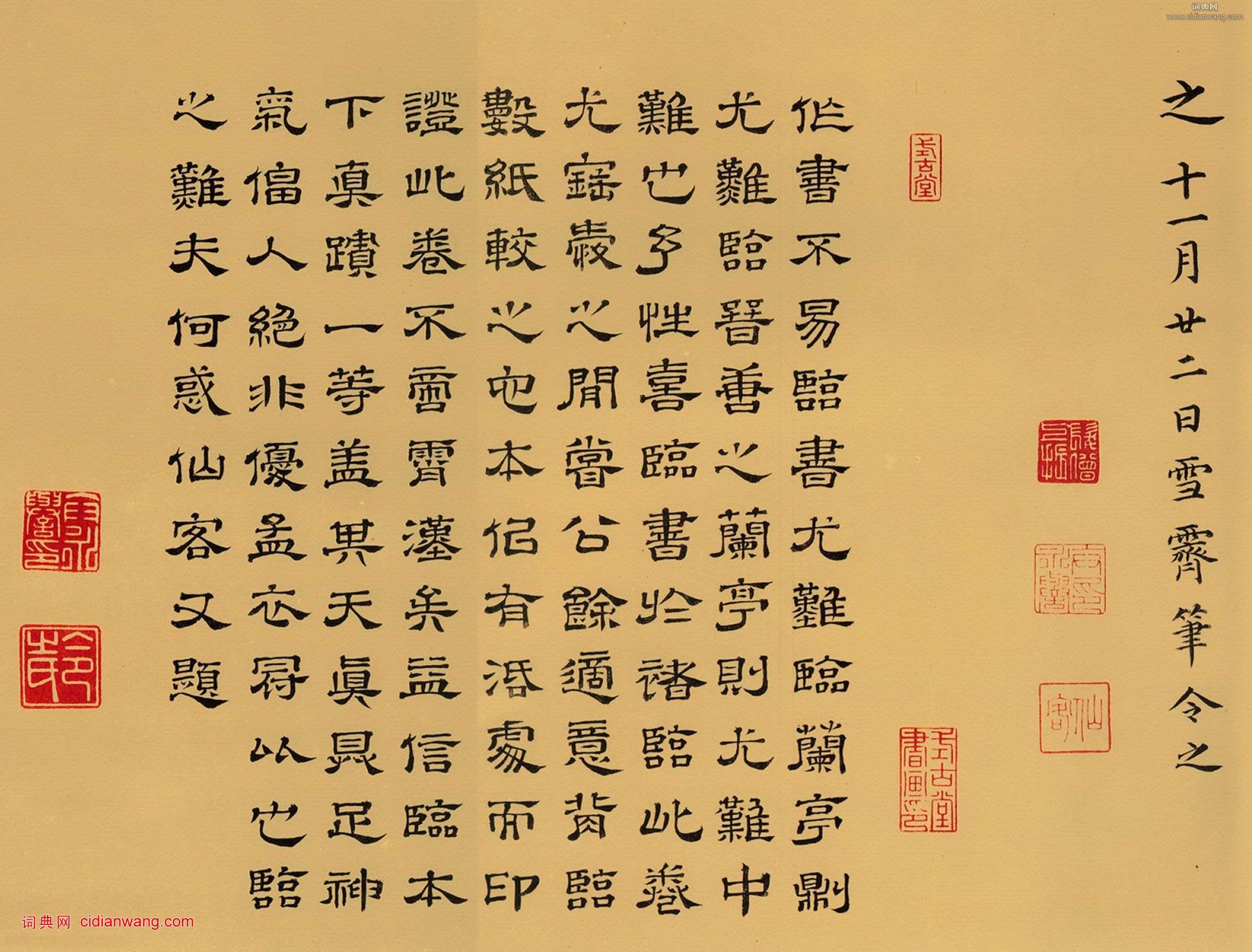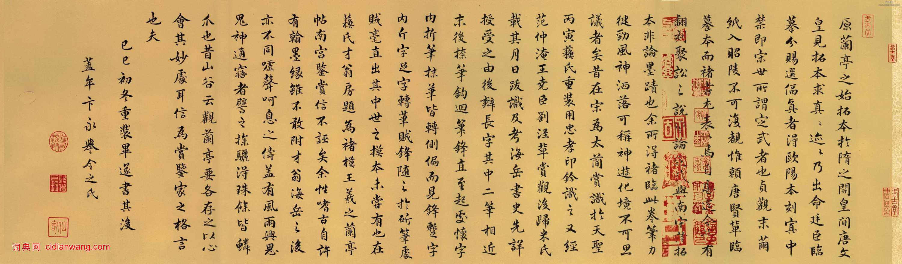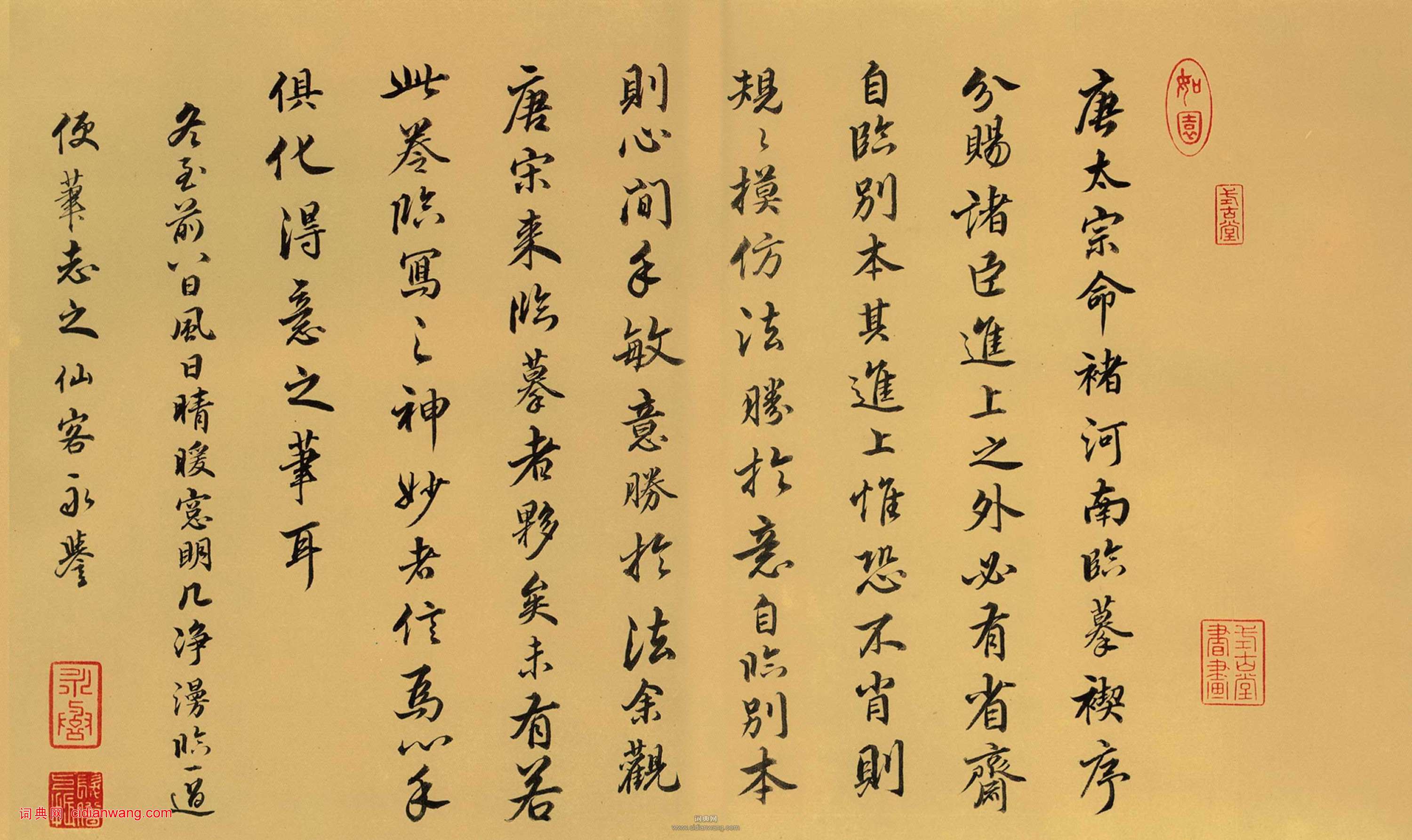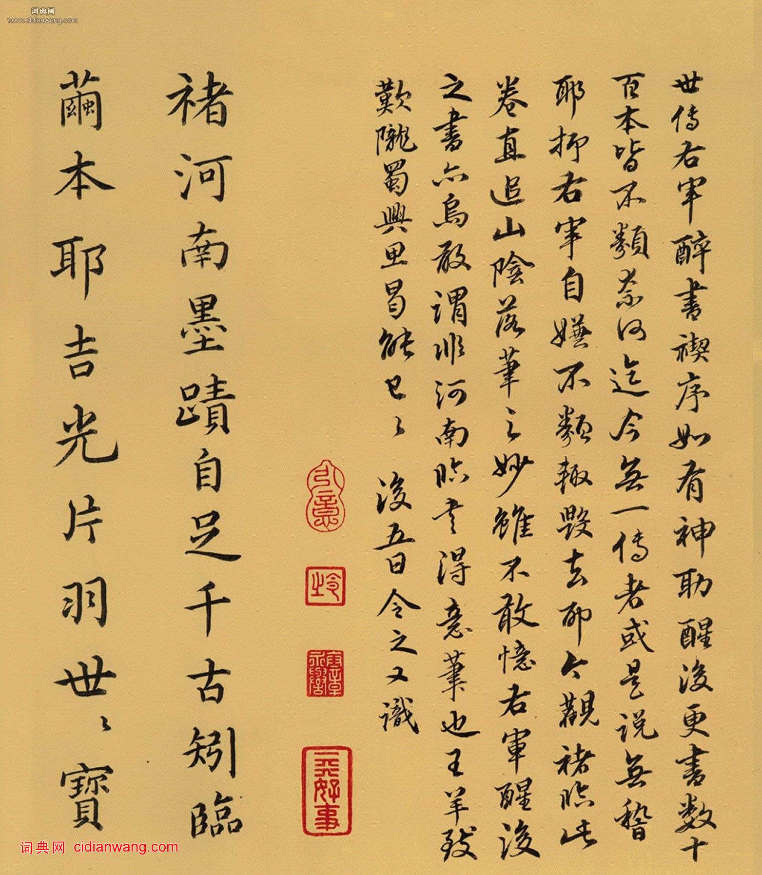 書法欣賞魏晉書法唐朝書法宋朝書法元朝書法明朝書法清朝書法近現代書法字典網>> 歷代書法>> 清朝>> 卞永譽·跋《褚摹蘭亭序》正文 卞永譽·跋《褚摹蘭亭序》作者:卞永譽 書體:行書 卞永譽跋《褚摹蘭亭序》,題跋前後共五段。北京故宮博物院藏。卞永譽(1645-1712),清代書畫鑑賞家。字令之,號仙客,隸漢軍鑲黃旗,祖籍河南。康熙間,由蔭生官至刑部左侍郎。自幼愛好書畫,當時,孫承澤、梁清標、曹溶等鑑藏名家尚在,卞永譽經常“具筆札,就其齋閣,伏聆緒論,目睹手寫,樂此不疲”。在清初的鑑賞家中,卞永譽是頗有影響的人物。著有《式古堂書畫匯考》、《式古堂集》等。大圖看下一頁2015-3-13 19:31:48 相關文章:趙孟頫《行草陶淵明五言詩頁》 (行草)趙孟頫《行草陶淵明五言詩頁》 縱32.7厘米 橫45.8厘米 北京故宮博物院藏書...楊凝式《神仙起居法帖》 (草書)【釋文】神仙起居法。行住坐臥處,手摩脅與肚,心腹痛快時,兩手腸下踞,踞之澈膀腰,...龔賢·題《山水冊》 (行書)龔賢題《山水冊》,行書。龔賢(1618—1689)明末清初著名畫家,金陵八大家之...郭尚先《行書橫幅》 (行書)郭尚先《行書橫幅》紙本行書 45×97cm 淮安市博物館藏 釋文:趙文敏家藏小...林散之《隸書俾壽八言聯之一》 (隸書)林散之《隸書俾壽八言聯之一》132×31 三十年代 林生若藏釋文:俾壽而藏書傳...尹元凱篆書《美原神泉詩碑》 (篆書)《新唐書》載:尹元凱,瀛州樂壽人。由慈州司倉參軍坐事免,棲遲不出者三十年。與張說...釋擔當·草書五絕詩軸 (草書)【釋文】土滿鋤難劃,牆低砍茨圍。我能存厚道,瓜菜自然肥。擔當。釋擔當《五絕詩軸》...唐寅《行書題松崖圖五言詩扇面》 (行書)唐寅《行書題松崖圖五言詩扇面》紙本行書 廣州藝術博物館藏 釋文:長松積...三國·魏《三體石經殘石》 (三體)三國·魏《三體石經殘石》 陝西西安碑林博物館藏 又稱《正始石經》。因用古文、小...何紹基楷書《安得壯哉七言聯》 (楷書)何紹基《楷書“安得壯哉”七言聯》紙本楷書 337×51.3cm×2 道光...