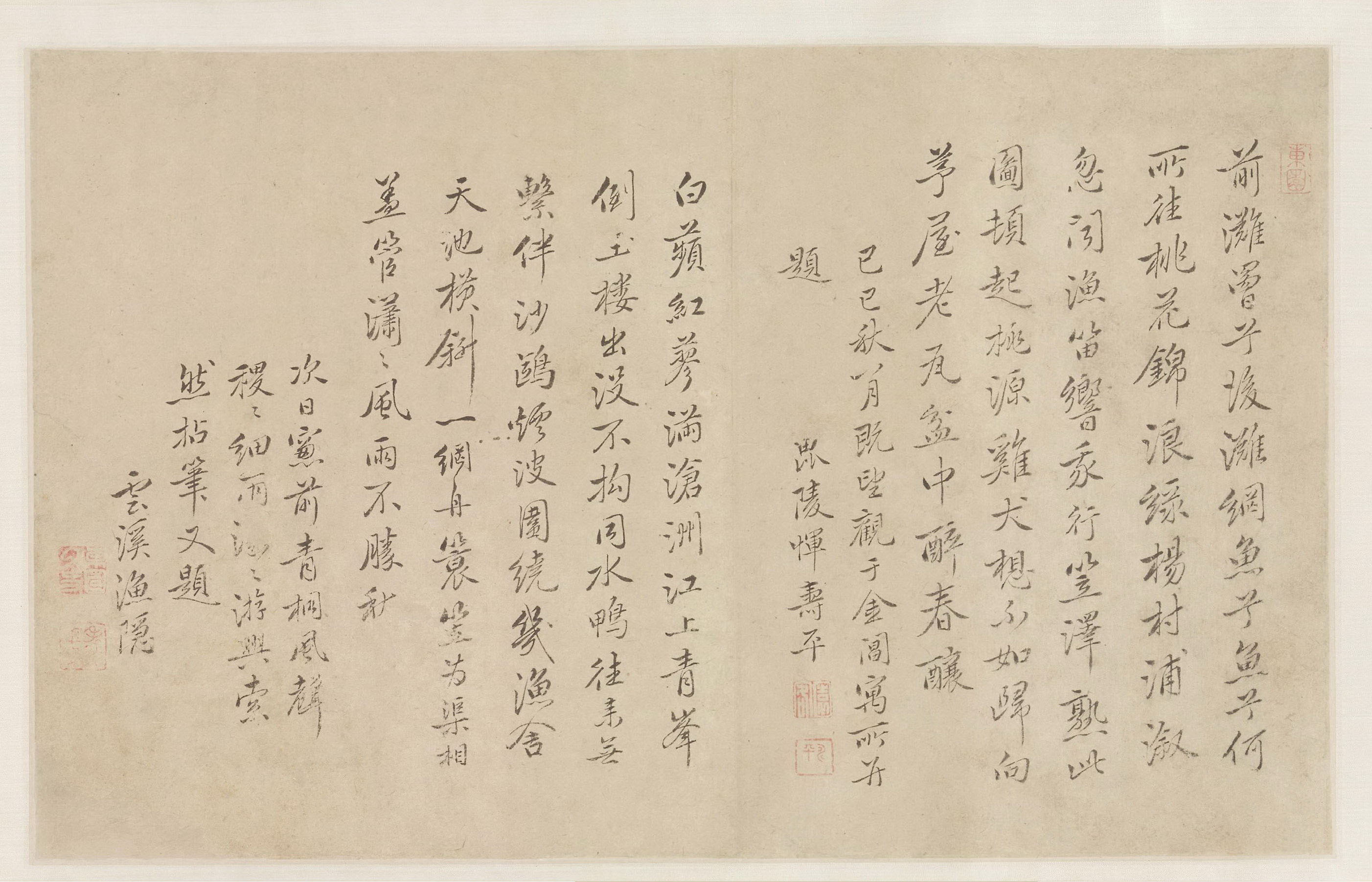 書法欣賞魏晉書法唐朝書法宋朝書法元朝書法明朝書法清朝書法近現代書法字典網>> 歷代書法>> 清朝>> 惲壽平·跋錢榖《桃花源圖》正文 惲壽平·跋錢榖《桃花源圖》作者:惲壽平 書體:行書 惲壽平跋錢榖《桃花源圖》卷,縱37cm。美國克利夫蘭美術館藏。惲壽平的相關書法作品:惲壽平《臨帖三種》 惲壽平·跋錢榖《桃花源圖》 相關文章:敦煌《食療本草》殘卷 (楷書)敦煌《食療本草》殘卷 紙本,捲軸。26.6x240cm 公元400-934 英國...張雨行書《致方鳳札》 (行書)天曆元年(1328) 張雨《致方鳳札》紙本 24.5×22.5cm 美國程可庵...包世臣《行書玉笈瓦當八言聯》 (行書)包世臣《行書玉笈瓦當八言聯》灑金箋本行書 152×28.5cm×2 西泠印社...李倜·跋陸柬之書文賦卷 (行書)李倜《跋陸柬之書文賦卷》,紙本,縱23.3cm。台北故宮博物院藏。《文賦》系唐代...祝允明草書《自書詩卷》 (草書)祝允明《自書詩卷》 紙本草書,47.3×321.3cm 正德十五年(公元152...鍾繇·薦季直表 (楷書)鍾繇書於魏黃初二年(221),楷書,書時鐘繇已七十高齡。此表內容為推薦舊臣關內侯...盧中南楷書《白居易長恨歌》 (楷書)盧中南楷書《白居易長恨歌》寫於2010年12月。盧中南1950年生。中國書法家協...金運昌.乾隆題畫詩 (隸書)釋文:茅齋幾架碧溪邊,拂鬢天風意欲仙。松韻湍聲相問答,高人屬耳似聽禪。...東晉《劉媚子墓誌》 (隸書)劉媚子墓誌(石志) 太和六年(371) 1998年9~12月,南京市博物館在該市...張瑞圖《行書廣陵三月七絕詩軸》 (行書)張瑞圖《行書廣陵三月七絕詩軸》紙本行書 189×65.5cm 山西省博物館藏釋...