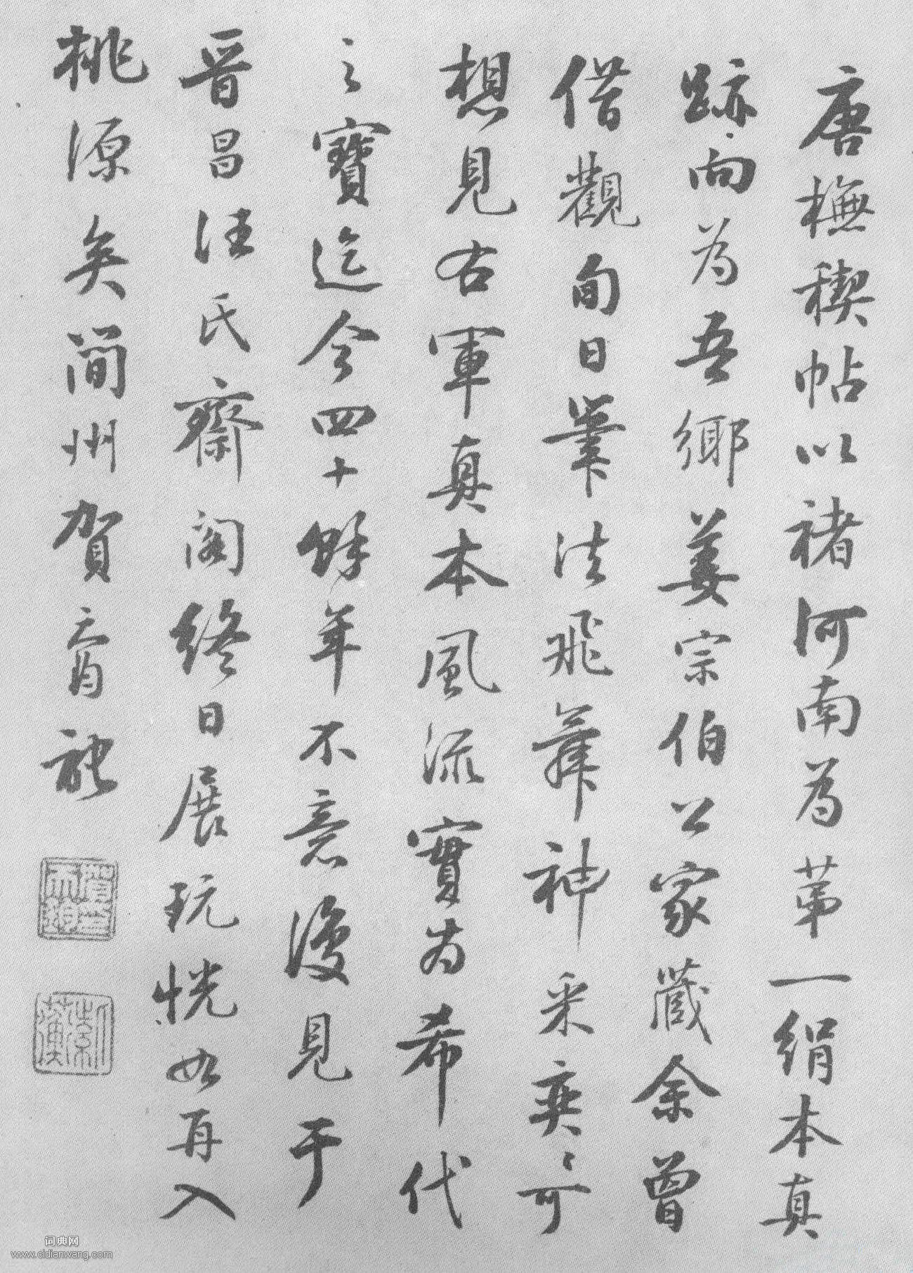 書法欣賞魏晉書法唐朝書法宋朝書法元朝書法明朝書法清朝書法近現代書法字典網>> 歷代書法>> 清朝>> 賀天均·跋《唐摹蘭亭序》正文 賀天均·跋《唐摹蘭亭序》作者:賀天均 書體:行書 【釋文】唐撫稧帖以褚河南為第一,絹本真跡向為吾鄉姜宗伯公家藏。余曾借觀旬日,筆法飛舞,神采奕奕,可想見右軍真本風流,實為希代之寶。迄今四十餘年,不意復見於晉昌汪氏齋閣,終日展玩,恍如再入桃源矣。簡州賀天均記。賀天均跋《唐摹蘭亭序》,行書。湖南省博物館藏。相關文章:翁同龢楷書《清故優貢生詔舉孝廉方正俞君墓誌》 (楷書)翁同龢楷書書法《清故優貢生詔舉孝廉方正俞君墓誌》,翁同龢官至協辦大學士,戶部尚書...黃道周行書《請假得歸途次偶作詩軸》 (行書)黃道周《請假得歸途次偶作詩軸》紙本行書 142×38cm 山東省博物館藏釋文:...徐無聞《大篆在公遇事七言聯》 (篆書)徐無聞《大篆在公遇事七言聯》 122×28cm×2 1988年 私人收藏釋文...徐枋行書《五言詩軸》 (行書)徐枋《五言詩軸》紙本行書 206.1×48.3cm 上海博物館藏 釋文:日觀東...趙昚·草書後赤壁賦卷 (草書)草書《後赤壁賦》卷,宋孝宗趙昚書,用金泥墨書寫在高尚莊嚴的磁青紙上,縱24.5厘...蒲華《行書自作詩四首》 (行書)蒲華《行書自作詩四首》釋文:瑤台豈不得春多,花木叢香聚綺羅。拾級登臨高百尺,無涯...鍾紹京·靈飛經 (小楷)《靈飛經四十三行墨跡本》,美國紐約大都會藝術博物館藏,每頁20.8×8.9cm...書法創作必備琴心聯語108對《琴心聯語》一、虛窗得月閑沽酒,琴室有蘭漫改詩。二、千山鱗甲松風勁,一曲陽春曲韻...蘇軾《治平帖》 (行書)【釋文】軾啟:久別思念不忘,遠想體中佳勝,法眷各無恙。佛閣必已成就,焚修不易。數...沈荃《行書臨爭座位帖軸》 (行書)沈荃《行書臨爭座位帖軸》綾本行書 238×50cm 天津博物院藏 【資料來源】...