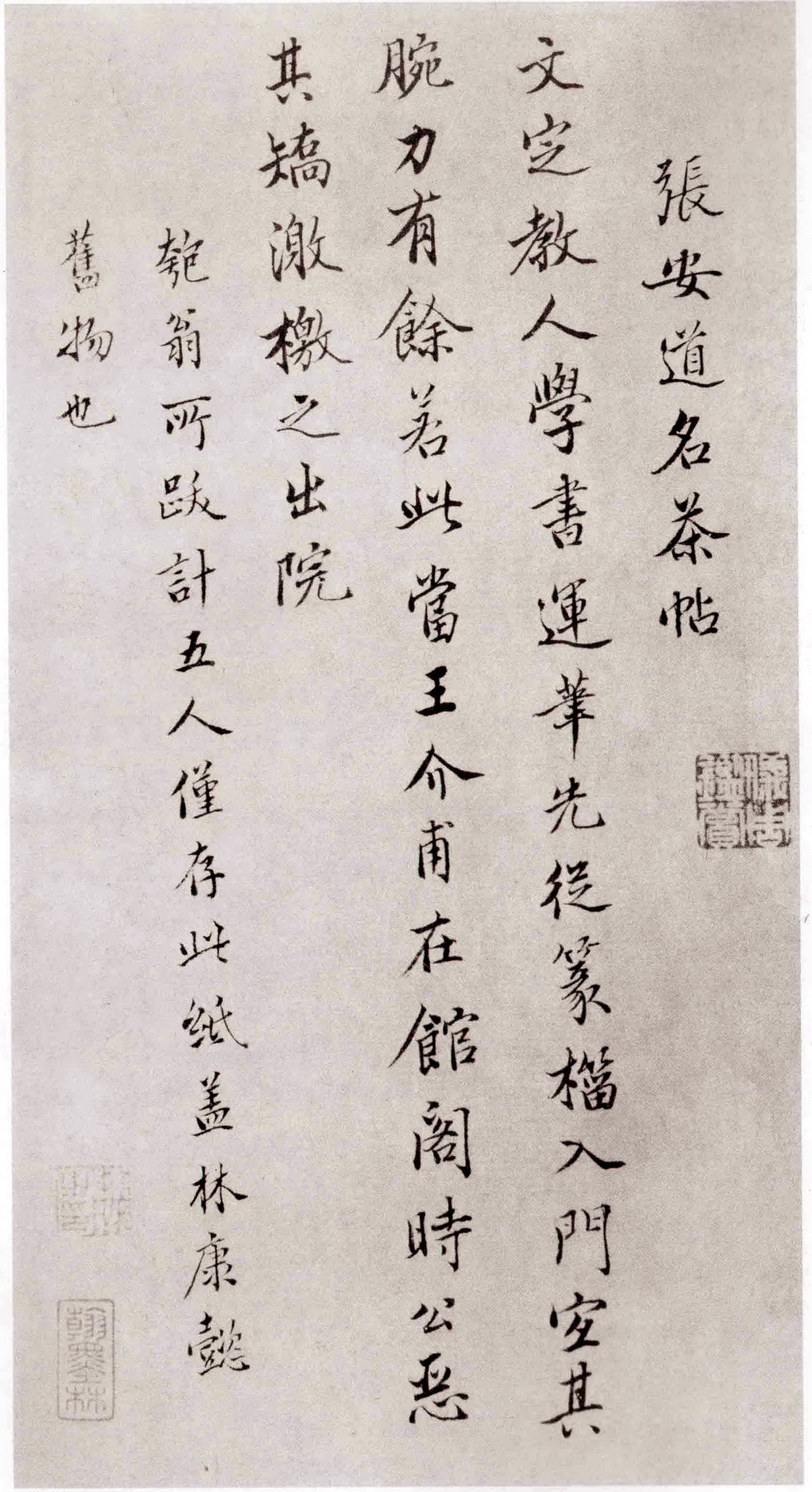書法欣賞魏晉書法唐朝書法宋朝書法元朝書法明朝書法清朝書法近現代書法字典網>> 歷代書法>> 清朝>> 安岐·跋張方平《名茶帖》正文 安岐·跋張方平《名茶帖》作者:安岐 書體:楷書 【釋文】張安道名茶帖。文定教人學書運筆先從篆榴入門宜其腕力有餘若此當王介甫在館閣時公惡其矯激檄之出院。匏翁所跋計五人僅存此紙蓋林康懿舊物也。安岐跋張方平《名茶帖》。台北故宮博物院藏。相關文章:書法該怎么讀帖?讀貼,拿著古代碑帖讀。有人說“看”帖和“讀”帖一樣,其實完全不然,一字之差,卻相...馮子振·虹月樓記卷 (行書)馮子振《虹月樓記卷》,紙本,33.4×320.8cm。上海博物館藏。《行草虹月...宋曹行草《錄懷素自敘帖句軸》 (行草)宋曹《錄懷素自敘帖句軸》綾本行草 182×86.7cm 山東省博物館藏釋文:夫...王安中·跋唐人誥命殘卷 (行書)王安中《跋唐人誥命殘卷》,高27.2cm。南京博物院藏。米芾行楷《王略帖贊》 (行楷)米芾王略帖贊 (《破羌帖跋贊》) 行楷書 縱22.9厘米 橫48.2厘米 北京故...北齊《泰山佛說金剛經》 (隸書)《泰山經石峪》,又名《泰山佛說金剛經》,摩崖石刻,北齊天保間刻,刻于山東泰山斗母...康有為《行書側身獨立七言聯》 (行書)康有為《行書側身獨立七言聯》紙本行書 150×39cm×2 浙江省博物館藏 ...房弘毅楷書《王羲之用筆賦》 (楷書)房弘毅,著名硬筆書法家。中國書法家協會會員。1955年生於北京。自幼喜愛書法,塗...梁同書·維摩詰所說法供養品 (小楷)縱26.5厘米,橫11.5厘米,18開,紙本,1976年劉國鈞先生捐。此冊書於嘉...張瑞圖《行書李夢陽七絕詩軸》 (行書)張瑞圖《行書李夢陽七絕詩軸》絹本行書 148×46cm 南通博物苑藏釋文:壇官...