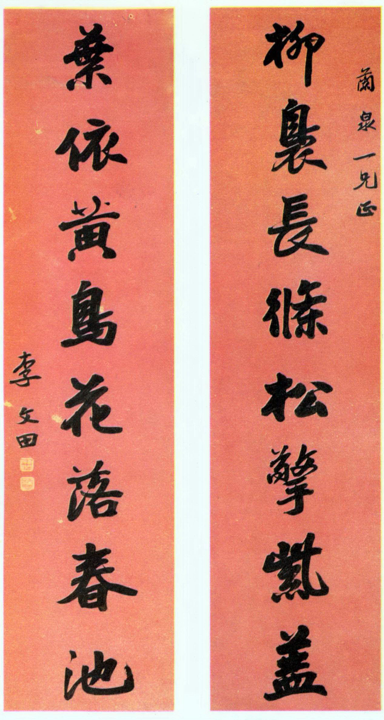 書法欣賞魏晉書法唐朝書法宋朝書法元朝書法明朝書法清朝書法近現代書法字典網>> 歷代書法>> 清朝>> 李文田《八言聯》正文 李文田《八言聯》作者:李文田 書體: 釋文: 柳裊長條 松擎紫蓋 葉依黃鳥 花落春池 李文田 李文田《八言聯》,此《八言聯》酣暢飽滿,工穩華滋,可以見到其在唐碑臨習的基礎上,在魏碑上也下了很大的功夫。李文田的相關書法作品:李文田楷書《楷書濁醪春陽八言聯》 李文田《楷書威鳳芝蘭八言聯》 李文田《行楷七言聯》 李文田《行書七律詩軸》 李文田《八言聯》 李文田《行楷集蘭亭序十一言聯》 李文田《行楷折芳援筆七言聯》 李文田《致雨生書札》 相關文章:怎樣臨習《乙瑛碑》 (隸書)注意要點:一、首先應從字的筆畫特徵上進行分析和分類練習,通過同一類範字筆畫若干種...豐坊·跋張旭《草書古詩四首》 (楷書)豐坊跋張旭《草書古詩四首》,遼寧省博物館藏。邢慈靜《行書五言詩》 (行書)邢慈靜生卒年代不詳。臨邑(今屬山東)人。邢侗之妹。號蒲團主人、蘭雪齋主。貴州左布...吳熙載《草書花底燈前七言聯》 (草書)吳熙載《草書花底燈前七言聯》 136×28cm×2 西泠印社藏釋文:花底振衣...王羲之集字《心經》 (行書)鹹享三年(公元672年)弘福寺為弘揚佛法和紀念玄奘在該寺翻譯經文,在寺內又樹碑立...吳昌碩《篆書魚游虎出八言聯》 (篆書)吳昌碩《篆書魚游虎出八言聯》 214×50cm×2 1921年 西泠印社藏 ...蘇軾行書《石恪畫維摩贊》 (行書)蘇東坡《石恪畫維摩贊》,此《贊》先依《維摩經》夸維摩詰之神力,歸結為石恪以筆端畫...虞世南《潘六帖》 (草書)【釋文】潘六雲司未得近問。莫邪數小奴等,計不日當有狀來。虞世南《潘六帖》,拓本,...鍾繇·薦季直表 (楷書)鍾繇書於魏黃初二年(221),楷書,書時鐘繇已七十高齡。此表內容為推薦舊臣關內侯...米芾·焚香帖 (草書)【釋文】雨三日未解,海岱只尺不能到,焚香而已。日短不能晝眠,又人少往還,惘惘!足...
