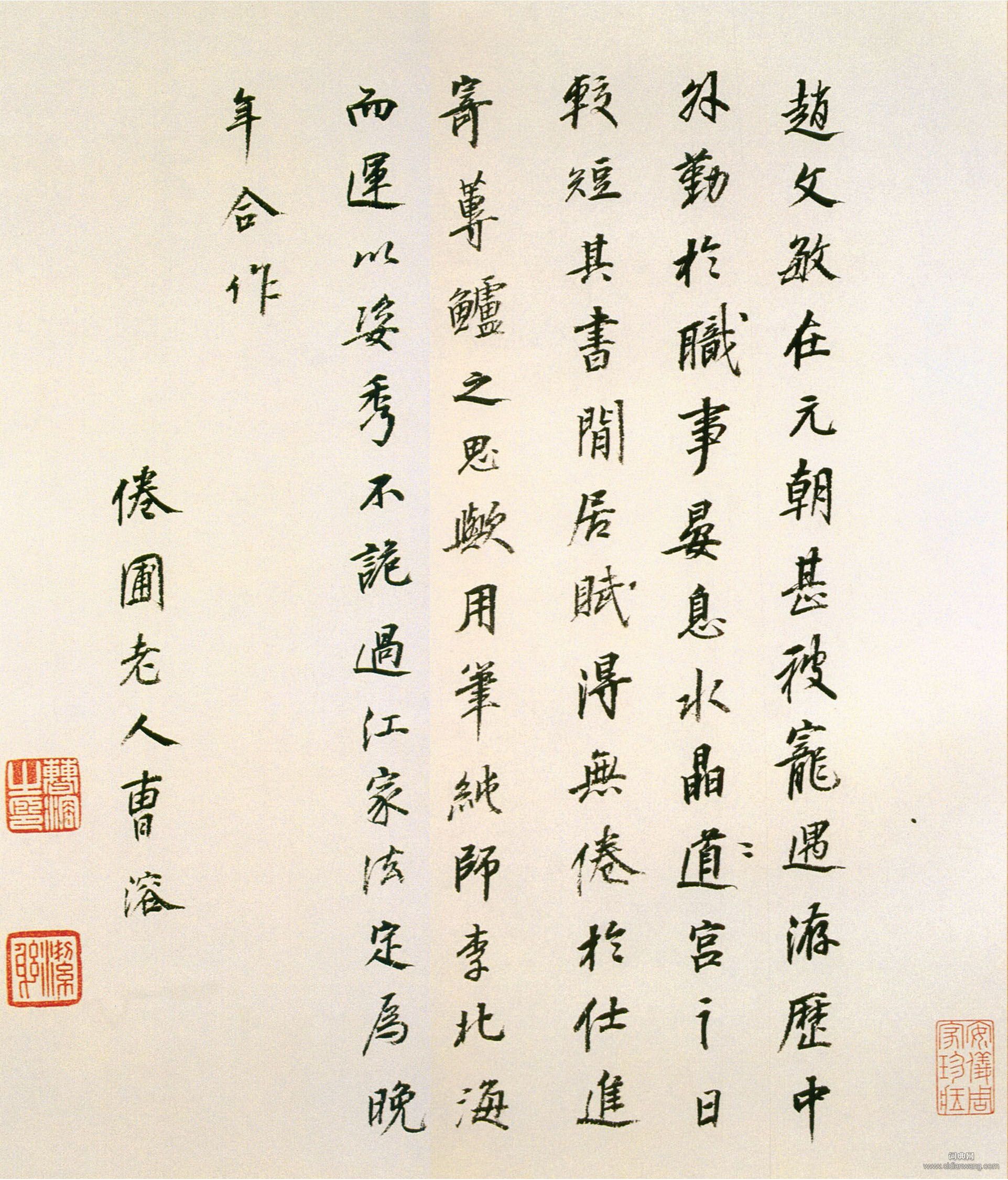 書法欣賞魏晉書法唐朝書法宋朝書法元朝書法明朝書法清朝書法近現代書法字典網>> 歷代書法>> 清朝>> 曹溶·跋趙孟頫《閒居賦》正文 曹溶·跋趙孟頫《閒居賦》作者:曹溶 書體:行書 曹溶跋趙孟頫《閒居賦》,行書,縱38厘米。北京故宮博物院藏。相關文章:翁同龢行書《節錄枯樹賦軸》 (行書)翁同龢《行書節錄枯樹賦軸》紙本行書 137.7×68cm 北京故宮博物院藏釋文...黃庭堅行書《松風閣詩帖》 (行書)《松風閣詩帖》是黃庭堅七言詩作並行書,墨跡紙本,縱32.8厘米 橫219.2厘米...李衎《楷書張公藝傳並贊卷》 (楷書)元代畫家,字仲賓,號息齋道人,薊丘(今屬北京市)人。官至集賢大學士、榮祿大夫。善...高鳳翰《行書自題牡丹冊》 (行書)高鳳翰《行書自題牡丹冊》 紙本行書 17×64cm 上海博物館藏釋文:(略) ...文徵明行草《城居煩暑詞翰冊》 (行草)明代,文徵明行草書法城居煩暑詞翰冊,六頁。釋文:城居煩暑避無方,野寺覓清涼。通湖...呂潛《行書自作七絕詩軸》 (行書)呂潛《行書自作七絕詩軸》紙本行書 186.4×61.1cm 上海博物館藏釋 文...祝允明小楷《和陶飲酒詩》 (小楷)祝允明《和陶飲酒詩》冊,每頁17.3×10.3厘米。台北故宮博物院藏。詩作於四...蘇軾行書《次韻三舍人省上詩帖》 (行書)蘇軾《次韻三舍人省上詩帖》釋文: 次韻 三舍人省上一首 。 紛紛榮瘴何能久?...左宗棠行書《少年虛己七言聯》 (行書)左宗棠《行書“少年虛己”七言聯》紙本行書 166.2×38.7cm×2 台北...傅山《草書軸》 (草書)傅山草書軸。釋文:待更新(有知道釋文的歡迎留言補充!)