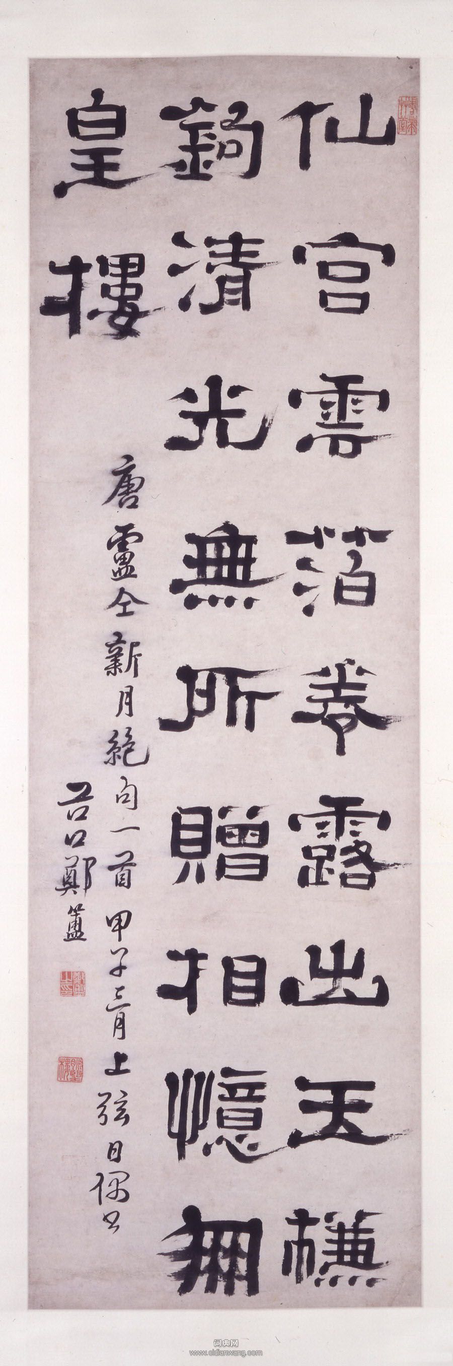 書法欣賞魏晉書法唐朝書法宋朝書法元朝書法明朝書法清朝書法近現代書法字典網>> 歷代書法>> 清朝>> 鄭簠《隸書五言詩》正文 鄭簠《隸書五言詩》作者:鄭簠 書體:隸書 鄭簠《隸書五言詩》,香港藝術館虛白齋藏。釋文:仙宮雲箔卷,露出玉簾鉤。清光無所贈,相憶鳳凰樓。唐盧仝新月絕句一首。甲子三月上弦日偶書。谷口鄭簠。鄭簠的相關書法作品:鄭簠隸書《古君子行五言詩》 鄭簠隸書《七律條幅》 鄭簠《隸書五言詩》 鄭簠《隸書蘇軾跋句軸》 鄭簠隸書《王績望野詩軸》 鄭簠《隸書五言詩》 相關文章:米芾《米南宮十七帖》 (草書)米南宮十七帖為宋米芾《王羲之十七帖》臨摹本,真草對照,甚得原作精髓。原帖是傳世著...蘇軾·跋吏部陳公詩帖 (行書)【釋文】故三司副使吏部陳公 軾不及見其人,然少時所 識,一時名卿盛士多推 尊之,...貢師泰·跋米友仁《瀟湘奇觀圖》 (楷書)【釋文】江南奇觀在北固諸山,而北固奇觀又在東崗海岳,晴雨晦明中執筆模寫,非其中胸...寶璽印存《雍正寶藪》篆刻精品篆刻精品寶璽印存《雍正寶藪》完整版,現存巴黎,法國吉美博物館。封面 左上:雍正...康熙行書《千字文》精品 (行書)康熙皇帝(1654—1722),順治皇帝第三子。康熙帝遍臨諸家法帖,尤其對董其昌...史可法·行書手札一 (行書)史可法《行書手札》。魏碑《劉根等造像》 (楷書)《劉根等人造像碑》39.5×144㎝ 北魏正光五年(524年)五月刻 河南省博...康里巎巎草書《謫龍說》 (草書)康里巎巎《謫龍說》卷 紙本 草書, 28.8×137.9cm 北京故宮博物院藏...文徵明《草書七律立軸》 (草書)草書七律立軸 見於中國嘉德國際拍賣有限公司2005春季拍賣會中國古代書畫專場尺 ...駱秉章楷書《天地文章七言聯》 (行草)駱秉章《楷書“天地文章”七言聯》 129×30cm×2 湖南省博物館藏釋文:...