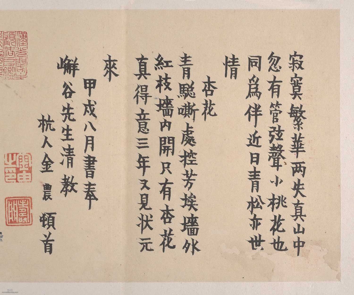 書法欣賞魏晉書法唐朝書法宋朝書法元朝書法明朝書法清朝書法近現代書法字典網>> 歷代書法>> 清朝>> 金農《為馬曰琯作畫詩》(4)正文 金農《為馬曰琯作畫詩》(4)作者:金農 書體:隸書 首 頁 上一頁 1 2 3 4 金農的相關書法作品:金農隸書《范石湖先生句》 金農漆書七絕軸 金農楷書《九老圖》 金農《隸書陳野水事軸》 金農《為馬曰琯作畫詩》 金農隸書《七言聯》 金農漆書《高軒清福七言聯》 金農隸書《節臨華山廟碑》 金農漆書《墨說蜀人景煥立軸》 相關文章:劉魁·跋范仲淹《道服贊》 (楷書)【釋文】黃山谷古今名書者猶推文正公小楷筆精而瘦勁自得古法世人可不知所重耶成化辛丑...魯迅《行書悼楊銓詩》 (行書)魯迅《行書悼楊銓詩》24.2×27.3cm 1933年 北京魯迅博物館藏釋文:...吳熙載篆書《庾信詠屏風詩扇面》 (篆書)吳熙載《篆書庾信詠屏風詩扇面》紙本 51.5×18.2cm 揚州市博物館藏釋文...趙孟頫·跋蘇軾《治平帖》 (行書)趙孟頫跋蘇軾《治平帖》,行書,北京故宮博物院藏。釋文:右二帖蘇東坡早年真跡,與其...李陽冰篆書《顏家廟碑額》 (篆書)李陽冰篆書《顏家廟碑額》 ,西安碑林藏。釋文: 顏氏家廟之碑。斷臂人張文佑書法欣賞 (行書)張文佑,字德輔,號月台經生。1970年生,河南襄城人,中國書法家協會會員。張文佑...王羲之行書結構92法王羲之行書結構92法,總結了關鍵點,把握的一定規律,細心觀摩思考一下,或許有所得...趙孟頫·續千字文卷 (行書)趙孟頫《續千字文卷》,24.3×153.3cm。附:《續千字文》是宋人侍其瑋模...錢良佑跋梁楷《右軍書扇圖》 (行書)錢良佑跋梁楷《右軍書扇圖》 北京故宮博物院藏張瑞圖《行書韋元旦詩》 (行書)張瑞圖《 行書韋元旦詩》軸 綾本 165×56cm 北京工藝美術博物館慶雲堂舊...