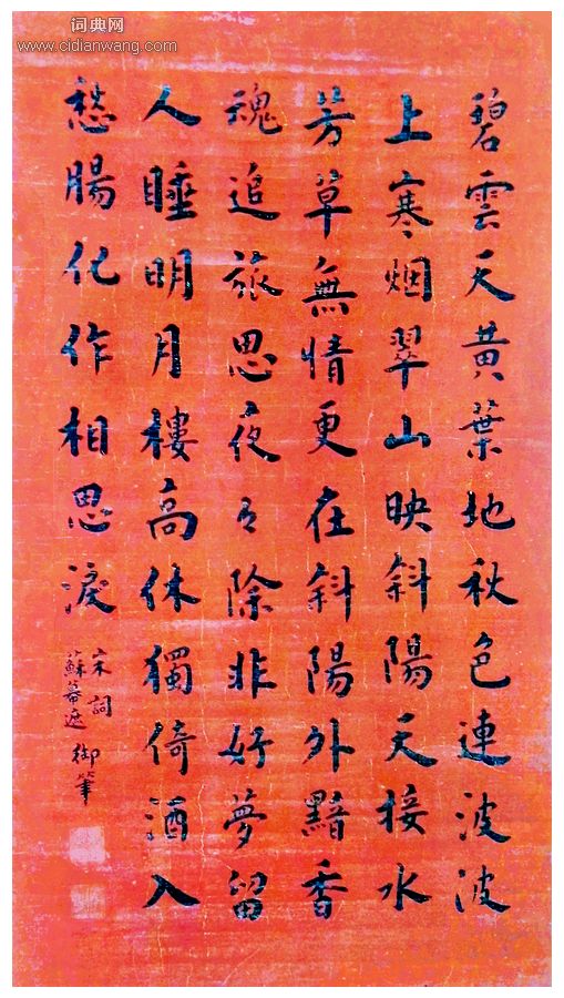 釋文:碧雲天,黃葉地。秋色連波,波上寒煙翠。山映斜陽天接水。芳草無情,更在斜陽外。黯鄉魂,追旅思。夜夜除非,好夢留人睡。明月樓高休獨倚。酒入愁腸,化作相思淚。 宋詞 蘇幕遮 御筆