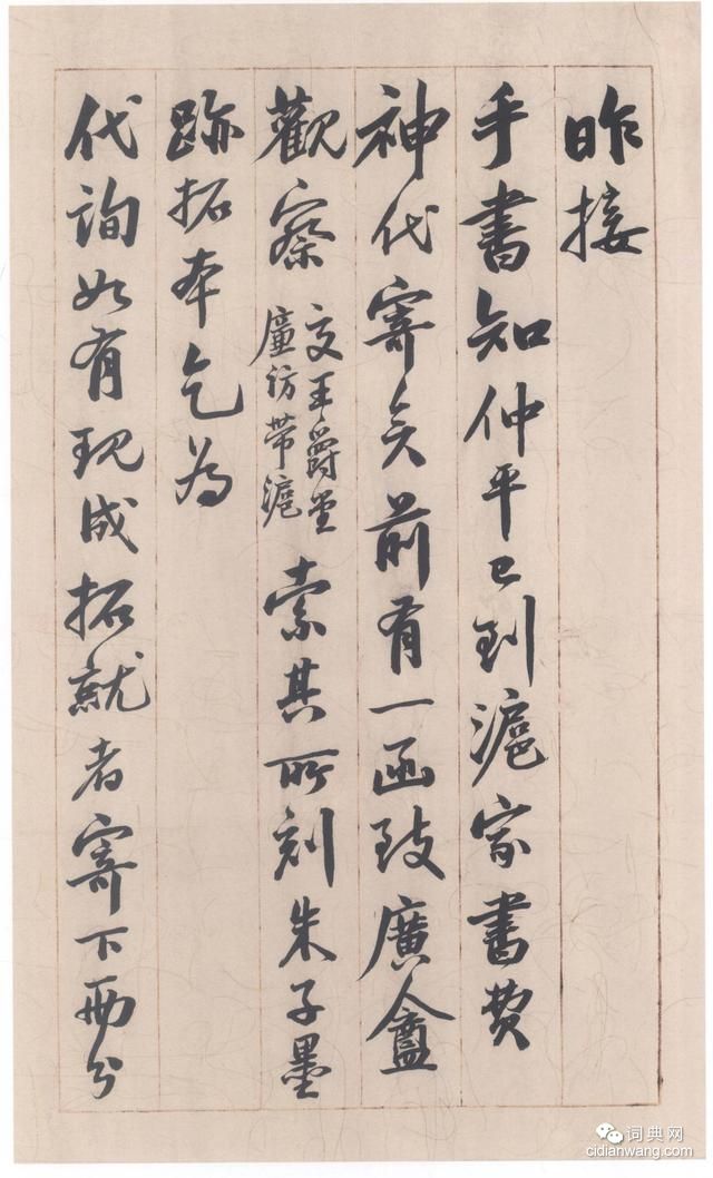 書法欣賞魏晉書法唐朝書法宋朝書法元朝書法明朝書法清朝書法近現代書法字典網>> 歷代書法>> 清朝>> 吳大澂行書手札(5)正文 吳大澂行書手札(5)作者:吳大澂 書體:行書 首 頁 上一頁 1 2 3 4 5 6 7 8 9 10 下一頁 尾 頁吳大澂的相關書法作品:吳大澂《篆書知過論軸》 吳大澂《行書手札》 吳大澂篆書《臨段敦(簋)》 吳大澂行書手札 吳大澂《篆書白鶴泉銘》 吳大澂行書《致大兄書札》 吳大澂散氏盤集字聯 吳大澂篆書《李公廟碑》 吳大澂篆書《從善有懷八言聯》 相關文章:蔡京行書《宮使帖》 (行書)|蔡京(1047-1126),宋代書家。字元長,興化汕遊人。登熙寧三年進士第。徽...王寵草書《自書五憶歌》 (草書)王寵《自書五憶歌》 紙本 草書 29.3×294.7厘米。台北故宮博物院藏。 ...張即之楷書《王禹偁待漏院記卷》 (楷書)張即之《書王禹偁待漏院記卷》皮紙楷書 41.5×2665.5cm 上海博物館藏...鄭簠隸書《王績望野詩軸》 (隸書)王績望野詩軸 紙本 隸書 縱108.5 橫74.3厘米 青島市博物館藏。資料來...陸師道·題仇英《仙山樓閣圖》 (楷書)【釋文】仙山賦。馳藻思兮何間關。搆圖繪兮非人間。將神遊之恍惚兮。抑倒景之曾攀。山...何紹基《行書一亭幽室七言聯》 (行書)何紹基《行書一亭幽室七言聯》紙本行書 122.2×28.5cm×2 南京博物...阮元《行書偶試但拋七言聯》 (行書)阮元《行書偶試但拋七言聯》紙本行書 111.1×29.1cm×2 南京博物院...蔡羽《游金陵詩》 (楷書)【釋文】禾黍離離苧葛輕,天河流水照人明。百重紫氣浮陵谷,千堞黃金擁帝城。甬道從來...蘇軾行書《尊丈帖》 (行書)蘇軾《尊丈帖》 約書於1093年(元祐八年) 釋文:尊丈不及作書 近以中婦喪亡 ...2017年王羲之集字春聯“書聖”王羲之集字春聯,俊朗 俊逸。1.一帆風順全家福,萬事如意滿門春2.山歡水...