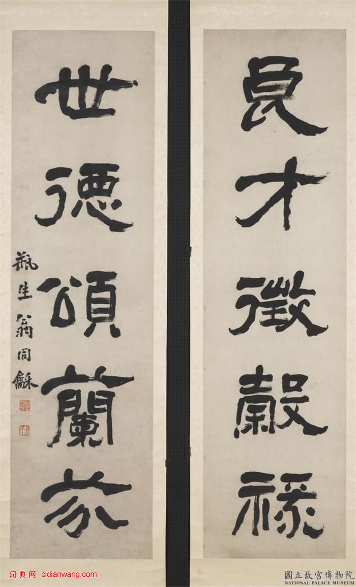 書法欣賞魏晉書法唐朝書法宋朝書法元朝書法明朝書法清朝書法近現代書法字典網>> 歷代書法>> 清朝>> 翁同龢隸書《良才世德五言聯》正文 翁同龢隸書《良才世德五言聯》作者:翁同龢 書體:隸書 翁同龢《隸書良才世德五言聯》紙本隸書 145.6×39.2cm×2 台北故宮博物院藏釋文:良才徵穀祿。世德頌蘭芬。 款識:瓶生翁同龢。 鈐印:翁同龢印(白文)、叔平(朱文)【資料來源】台北故宮博物院網站翁同龢的相關書法作品:翁同龢行書《垂竿翥鶴五言聯》 翁同龢《行書扇面》 翁同龢行書《掃地模山八言聯》 翁同龢楷書《清故優貢生詔舉孝廉方正俞君墓誌》 翁同龢行書《王士禎雨夜宿聖恩寺詩扇》 翁同龢隸書《解得自是五言聯》 翁同龢行書《錄蘇軾論畫語軸》 翁同龢行書《節錄枯樹賦軸》 翁同龢楷書《守獨辭高八言聯》 相關文章:三國魏《漢廬江太守範式碑》 (隸書)《範式碑》全稱《漢廬江太守範式碑》,又稱《范巨卿碑》。隸書,三國·魏青龍三年(...翁同龢行書《王士禎雨夜宿聖恩寺詩扇》 (行書)翁同龢《行書王士禎雨夜宿聖恩寺詩扇》紙本行書 18.3×52cm 常熟博物館藏...錢良佑行書跋《管道升書卷》 (行書)字翼之,號江村民,人因以江村先生稱之,平江(今湖南平江)人。至正間以書學名家,趙...王寵行書《玄墓之行帖》 (行書)王寵《玄墓之行帖》頁 台北故宮博物院藏 【釋文】向者玄墓之行。知臧判官至。不曾來...米芾墨跡十三帖 故宮珍藏! (行書)1、米芾《陳攬帖》(昨日帖)紙本 行書 縱25.9厘米 橫20.8厘米台北故宮博...沈尹默行書《歐陽修詩話單片》 (行書)沈尹默《歐陽修詩話單片》紙本行書【資料來源】《海派代表書家系列作品集——沈尹默》...吳大澂篆書《從善有懷八言聯》 (篆書)吳大澂《從善有懷八言聯》篆書169.4×35×2 台北故宮博物院藏 ...祝允明《樂志論草書軸》 (草書)祝允明《樂志論草書軸》 縱111.2厘米 橫29.3厘米 蘇州博物館藏圖片來自《...劉墉《行書句里舌端七言聯》 (行書)劉墉《行書句里舌端七言聯》蠟箋行書 93.5×21.2cm×2 安徽省博物...北魏《石門銘》精拓本 (楷書)《石門銘》全稱《泰山羊祉開復石門銘》,北魏宣武帝永平二年(509)正月刻,由太原...