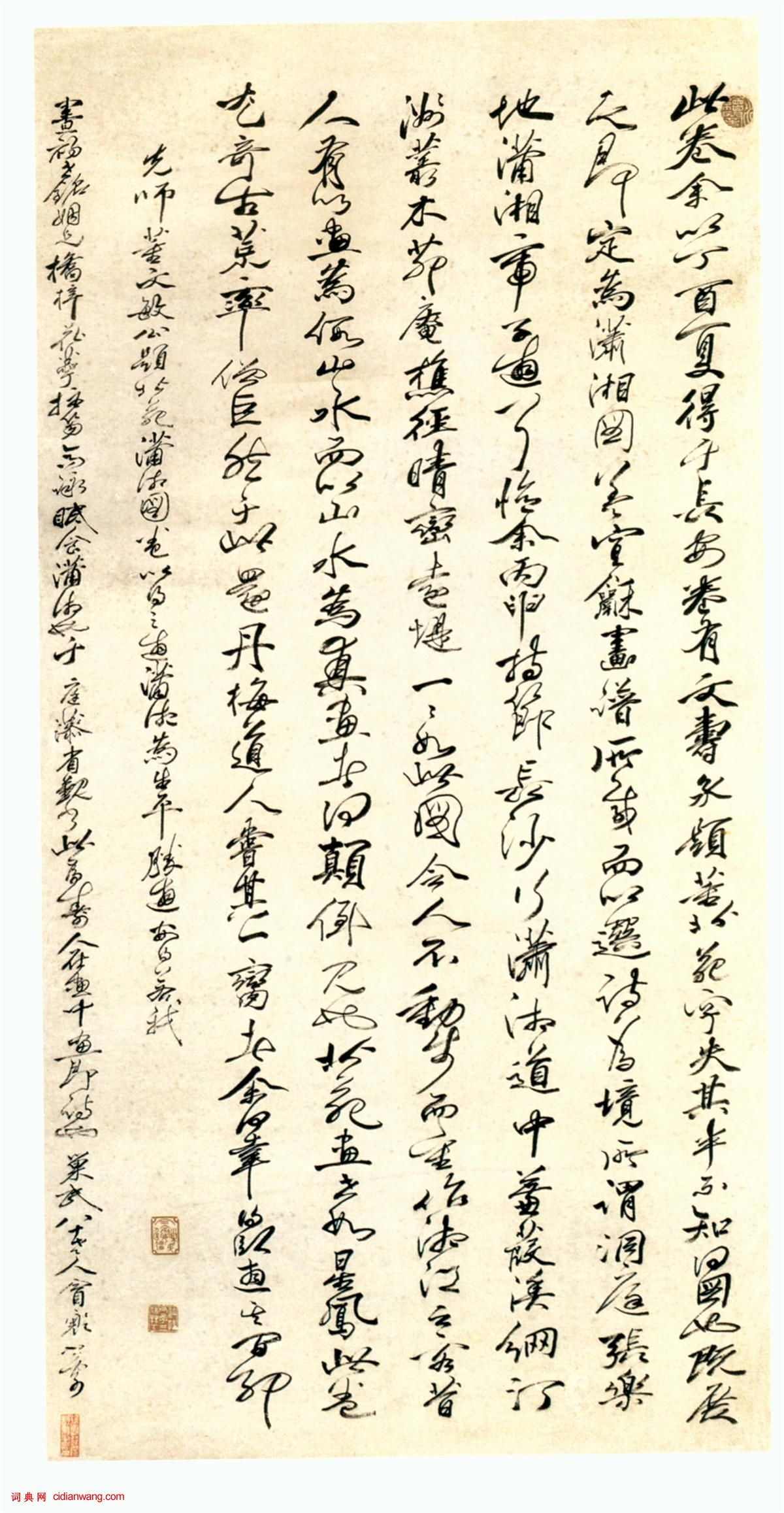 書法欣賞魏晉書法唐朝書法宋朝書法元朝書法明朝書法清朝書法近現代書法字典網>> 歷代書法>> 清朝>> 冒襄行草《瀟湘圖跋》正文 冒襄行草《瀟湘圖跋》作者:冒襄 書體:行草 冒襄《行草瀟湘圖跋》 紙本行草 123×61cm 南通博物苑藏【資料來源】《南通博物苑文物精華》(文物出版社)相關文章:張即之行書《棐茗帖》 (行書)張即之《棐茗帖》紙本行書 26.8×23.6cm 釋文:棐茗皆山中珍品拜貺感銘...陳奕禧草書《七絕立軸》 (草書)陳奕禧《草書七絕立軸》紙本草書 71.2×23.7cm 雲南省博物館藏釋文:長...董其昌《草書手札》 (草書)【釋文】楊宮兄見顧,語及長老世講事,已有兄意矣。憶得長老入山相託在我二老,今當索...柳公權楷書《大唐迴元觀鐘樓銘》 (楷書)柳公權《大唐迴元觀鐘樓銘》 124×60cm 西安市和平門外出土《大唐迴元觀鍾...什麼是永字八法一、點為側(如鳥之翻然側下)側是傾斜不正之意,點應取傾斜之勢,如巨石側立,險勁而...趙奕·跋趙孟頫《後赤壁賦》 (行書)趙奕跋趙孟頫《後赤壁賦》,行書,縱27.2厘米。現藏台北故宮博物院。陳鵬年《行書七絕詩軸》 (行書)陳鵬年《行書七絕詩軸》紙本行書 116×56cm 淮安市博物館藏釋文:楚雲西望...吳大澂篆書《集石鼓文樹古水流八言聯》 (篆書)吳大澂《集石鼓文樹古水流八言聯》篆書175.5×31.5cm×2 同治八年(...文同·跋范仲淹《道服贊》 (行書)文同跋范仲淹《道服贊》,行書,縱34.8cm,北京故宮博物院藏。文徵明行書《悟陽子詩序》 (行書)文徵明行書《悟陽子詩序》,為唐寅悟陽子圖卷後的文衡山書法題跋,遼寧博物館藏。法度...