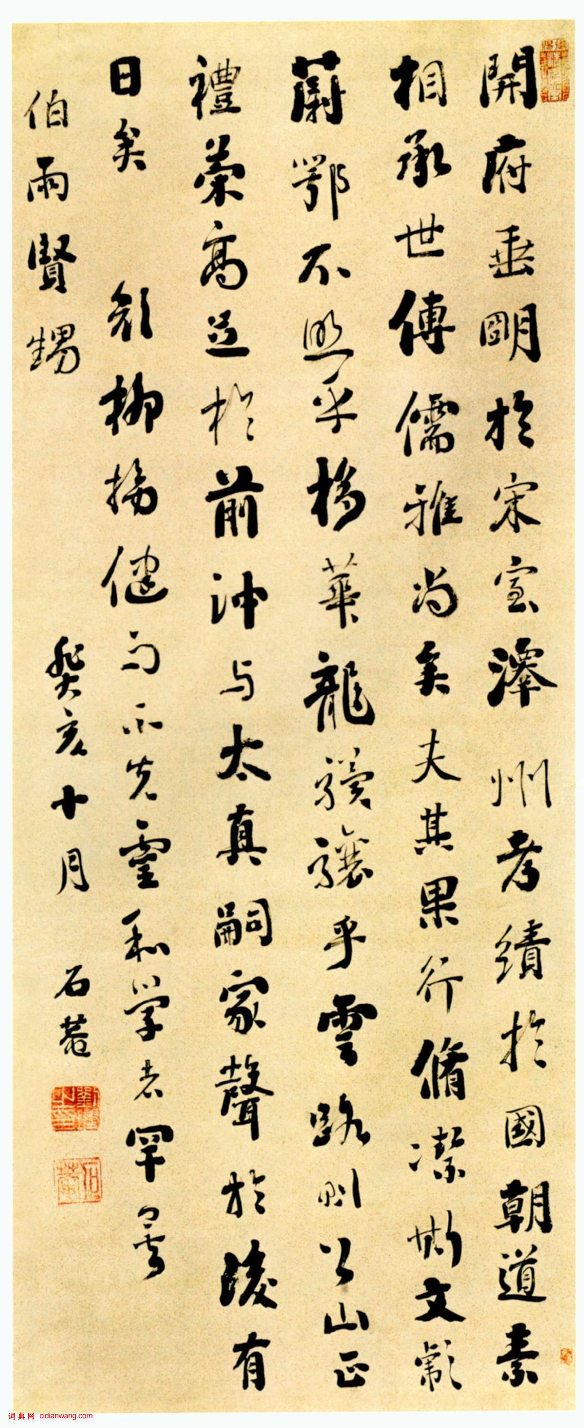 書法欣賞魏晉書法唐朝書法宋朝書法元朝書法明朝書法清朝書法近現代書法字典網>> 歷代書法>> 清朝>> 劉墉行書《節臨顏真卿送劉太沖序帖立軸》正文 劉墉行書《節臨顏真卿送劉太沖序帖立軸》作者:劉墉 書體:行書 劉墉《節臨顏真卿送劉太沖序帖立軸》 山東省博物館藏 釋文:開府垂明於宋室,澤州考績於國朝,道素相承,世傳儒雅,尚矣!夫其果行修潔,斯文彪蔚;鄂不照乎栘華,龍驥驤乎雲路。則公山正禮,策高足於前;沖與太真,嗣家聲於後,有日矣! 【資料來源】《中國書法》雜誌2010年第六期 劉墉的相關書法作品:劉墉行書《幽人仙客七言聯》 劉墉行書《沉香山子賦》 劉墉行書《錄杜甫贈李白詩頁》 劉墉行書《天機范水七言聯》 劉墉行書《錄容台集語軸》 劉墉《行書集陸游詩句聯》 劉墉行書《節臨顏真卿送劉太沖序帖立軸》 劉墉《臨顏真卿送蔡明遠敘行草軸》 劉墉行書《臨范文正公尺牘立軸》 相關文章:文徵明行草《西苑詩卷》 (行草)文徵明《西苑詩卷》局部(1554) 紙本 行草書 縱28.4厘米 橫447.4厘...王鐸《臨王獻之草書軸》 (草書)王鐸《臨王獻之草書軸》絹本,縱169厘米,橫49厘米 崑崙堂藏釋文為:“獻之(白...米芾行書《張季明帖》 (行書)米芾行書《張季明帖》約元祐元年(1086年)紙本 縱26.0厘米 橫34.5厘米...柳公權小楷《太上老君常清淨經》 (小楷)柳公權《太上老君常清淨經》 楷書 《太上老君常清淨經》,書法介於柳楷與王羲之小楷...詹景鳳《草書沈佺期詩軸》 (草書)詹景鳳《草書沈佺期詩軸》 絹本草書 200.5×43cm×4 香港中文大學...唐寅行書《望湘人·春日花前詠懷詩扇面》 (行書)唐寅《望湘人·春日花前詠懷詩扇面》金箋行書 19.6×52.7cm 南京博物...翁方綱行書《斜街行立軸》 (行書)翁方綱《斜街行立軸》紙本行書 132×33.8cm 天津博物館藏釋文:斜街紫藤...李賢·跋歐陽修《集古錄跋尾》 (行書)李賢跋歐陽修《集古錄跋尾》,行書。西晉隸書碑刻《齊太公呂望表》 (隸書)西晉隸書碑刻《齊太公呂望表》又稱《呂望表》,西晉太康十年(289)三月十九日刻。...徐三庚《篆書典校敷陳六言聯》 (篆書)徐三庚《篆書典校敷陳六言聯》紙本篆書 102.2×22cm×2 上海博物館藏...