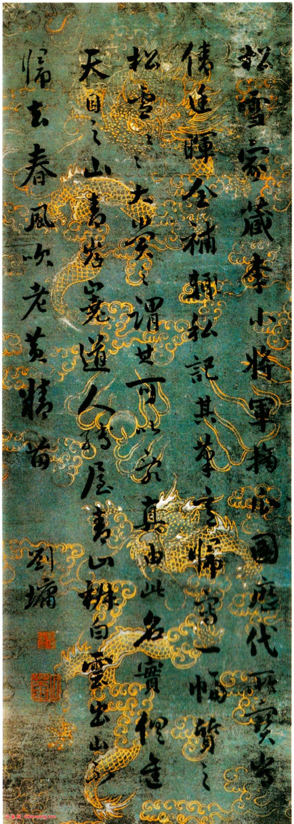 釋文:松雪家藏李小將軍摘瓜圖,歷代所寶,豈倩廷暉全補,輒私記其筆意,歸寫一幅質之松雪,松雪大賞之,謂其可以亂真,由此名實俱進。天目之山青岧嶤,道人縛屋青山椒。白雪出山不歸去,春風吹老黃精苗。劉墉。