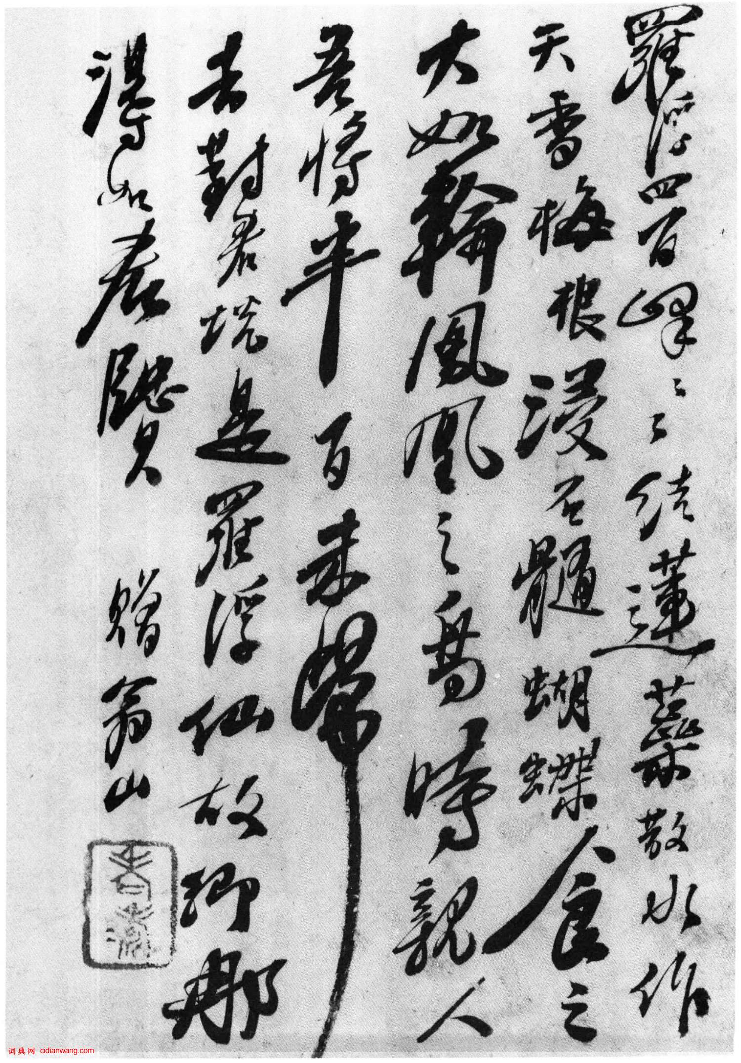 羅浮四百峰,峰峰結蓮;散水作天香,梅根浸石髓。蝴蝶食之大如輪,鳳凰之鳥時親人;吾將半百未歸去,對君恍是羅浮仙。故鄉那得如君賢,贈翁山。【資料來源】《中國書法全集》64卷朱耷石濤龔賢龔晴皋(榮寶齋出版)