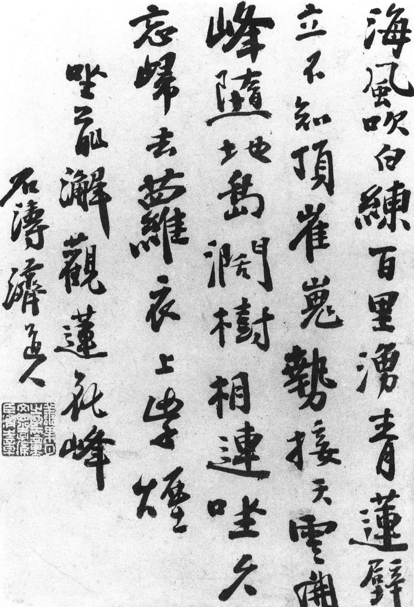 書法欣賞魏晉書法唐朝書法宋朝書法元朝書法明朝書法清朝書法近現代書法字典網>> 歷代書法>> 清朝>> 石濤行書《觀蓮花峰詩帖》正文 石濤行書《觀蓮花峰詩帖》作者:石濤 書體:行書 石濤《觀蓮花峰詩帖》 紙本行書 北京故宮博物院藏 【資料來源】《中國書法全集》64卷朱耷石濤龔賢龔晴皋(榮寶齋出版)石濤的相關書法作品:石濤《楷隸行三體雜錄卷》 石濤行書《觀蓮花峰詩帖》 石濤行書《李白詩三首》 石濤行書《與八大山人札》 石濤行書《客三槐堂詩頁》 石濤行書《贈翁山詩札》 石濤行書《記雨歌帖》 石濤行書《贈哲翁詩卷》 石濤行書《與哲翁二札》 相關文章:楊維楨《宴於朱氏玉井香賦詩十有二韻行書卷》 (行書)楊維楨《宴於朱氏玉井香賦詩十有二韻行書卷》行書 30.5×53cm 香港中文大...蔡襄《扈從帖》 (行書)【釋文】襄拜:今日扈從逕歸,風寒侵人,偃臥至晡。蒙惠新萌,珍感珍感!帶胯數日前見...張大千:書畫是最好的養生張大千▶張大千不僅在繪畫方面的造詣爐火純青,在養生方面也是很有研究的。張大千的健...歐顏柳趙,楷書入門怎樣選?楷書四大家是對書法史上以楷書著稱的四位書法家的合稱,也稱四大楷書。他們分別指是:...米芾行書《政事帖》 (行書)米芾《政事帖》(又稱春和帖) 紙本 行書 縱30.5厘米 橫40.8厘米 [釋文...張駿·行書手札 (行書)張駿《手札》,北京故宮博物院藏。刊於《中國書法》雜誌1991年第一期(贈頁)。沈周·跋陸游《懷成都十韻詩卷》 (行書)沈周跋陸游《懷成都十韻詩卷》,行草書,縱34.6cm。故宮博物院藏。王羲之行書《敬倫帖》2種 (行書)《敬倫帖》又名《九月三日帖》。4行,41字。高29厘米。行書。入刻《寶晉齋帖》。...黃姬水楷書《致舅翁大人札》 (楷書)黃姬水《楷書致舅翁大人札》紙本楷書 25.3×29.6cm 台北故宮博物院藏釋...李流芳行書《戲贈上方老僧似公實兄七言詩扇》 (行書)李流芳《行書"戲贈上方老僧似公實兄"七言詩扇》 上海博物館藏 釋文:楞伽山下薇村...
