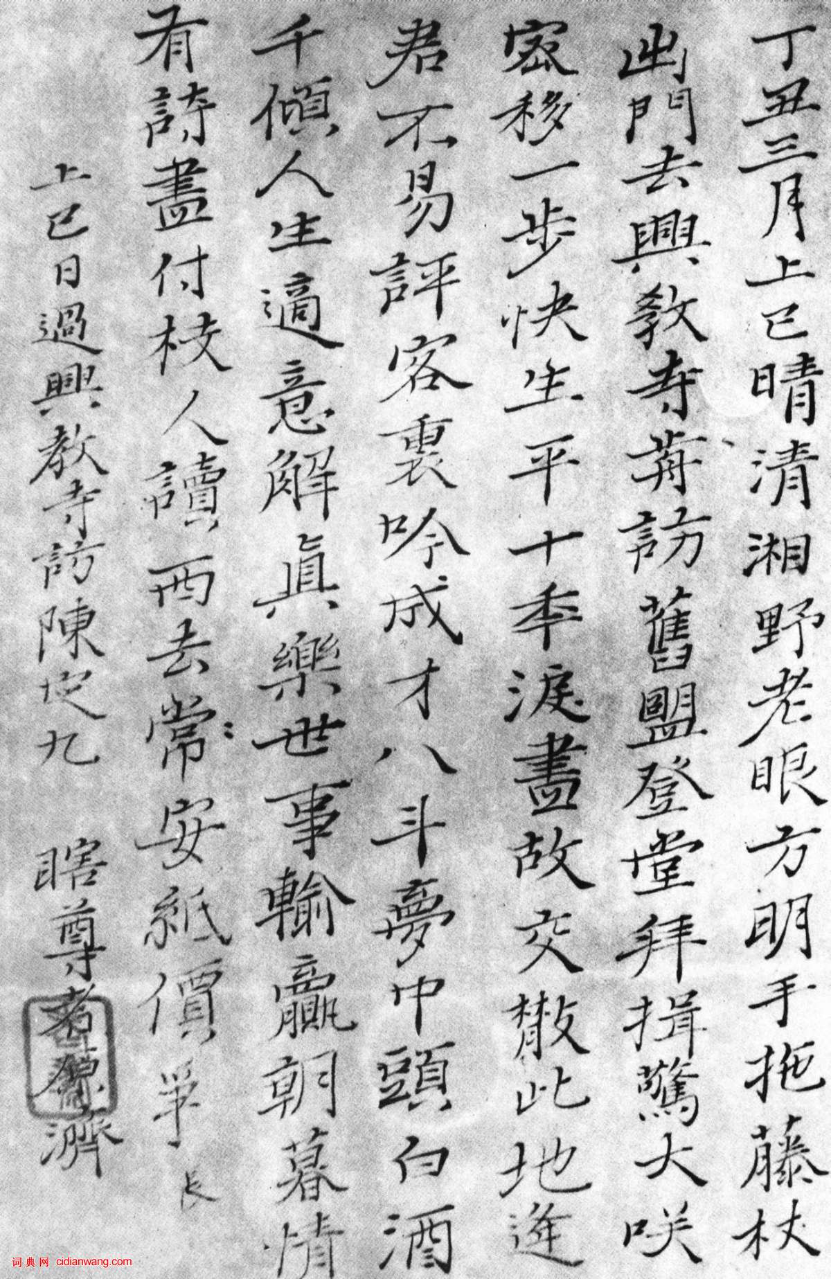 書法欣賞魏晉書法唐朝書法宋朝書法元朝書法明朝書法清朝書法近現代書法字典網>> 歷代書法>> 清朝>> 石濤《訪陳定九詩楷書帖》正文 石濤《訪陳定九詩楷書帖》作者:石濤 書體:楷書 石濤《訪陳定九詩楷書帖》 紙本 38×24.5 康熙三十七年(1698) 廣州美術館藏 【資料來源】《中國書法全集》64卷朱耷石濤龔賢龔晴皋(榮寶齋出版) 石濤的相關書法作品:石濤行書《李白詩三首》 石濤行書《記雨歌帖》 石濤《楷隸行三體雜錄卷》 石濤《訪陳定九詩楷書帖》 石濤《行書扇面》 石濤行書《與哲翁二札》 石濤行書《客三槐堂詩頁》 石濤行書《觀蓮花峰詩帖》 石濤行書《贈翁山詩札》 相關文章:董其昌行書《書畫合冊》 (行書)書畫合冊,無錫博物館藏 這是董其昌的“書畫合冊”行書三。此冊藏無錫博物館,書法六...朱耷《行書題畫詩軸》 (行書)朱耷《行書題畫詩軸》紙本行書 123.7×49.8cm 上海博物館藏釋文:漢去...張宇初·道家識語 (行草)【釋文】清微之謂道中之法也。以其非復天神霄酆岳者比焉。而非功行圓融。心法貫妙者。...王羲之《平安帖》《何如帖》《奉橘帖》 (行書)王羲之《平安》帖 釋文:此粗平安修載來十餘 日諸人近集存想明日 當復悉來無由同 ...王寵《草書七律詩》軸 (草書)王寵《草書七律詩》軸 紙本 行草 141.8×28.3cm 北京故宮博物院藏 ...鮮于樞·跋張先《十詠圖》 (行草)鮮于樞跋張先《十詠圖》,故宮博物館藏。《十詠圖》卷,宋,張先繪,絹本,淡設色,畫...蔡京行書《宮使帖》 (行書)|蔡京(1047-1126),宋代書家。字元長,興化汕遊人。登熙寧三年進士第。徽...罕見!文徵明手稿墨跡 (行草)文徵明書法溫潤秀勁,穩重老成,法度謹嚴而意態生動。雖無雄渾的氣勢,卻具晉唐書法的...高二適《行書劉禹錫贈日本僧智藏詩》 (行書)高二適《行書劉禹錫贈日本僧智藏詩》 33.4×137cm 1973年 江蘇省美...周必大·跋李結《西塞漁舍圖》 (行書)周必大跋李結《西塞漁舍圖》,縱40.7厘米。大都會美術館藏。