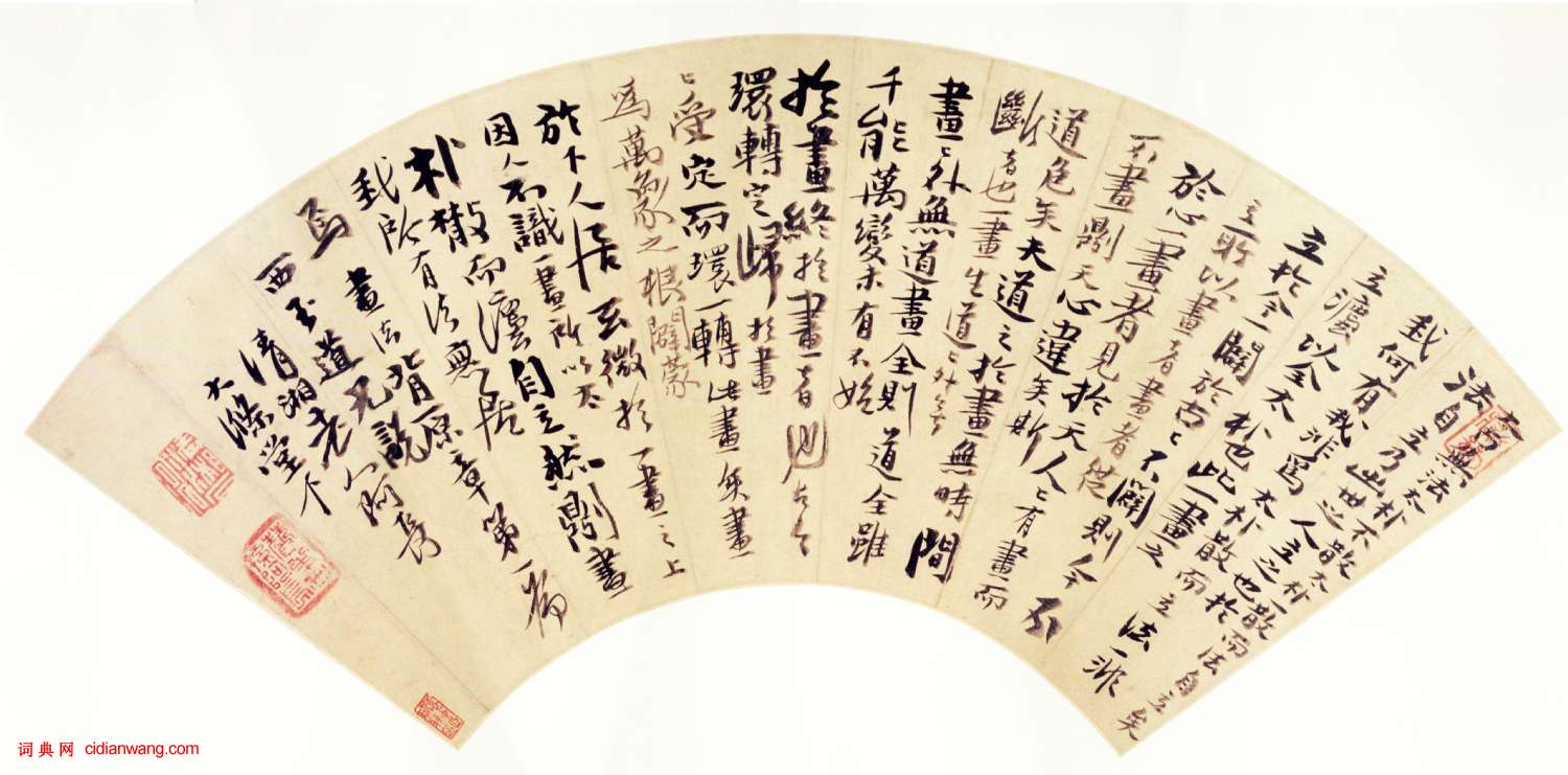 書法欣賞魏晉書法唐朝書法宋朝書法元朝書法明朝書法清朝書法近現代書法字典網>> 歷代書法>> 清朝>> 石濤《行書扇面》正文 石濤《行書扇面》作者:石濤 書體:行書 石濤《行書扇面》 紙本 上海博物館藏 【資料來源】《上海博物館藏中國明清書畫扇面名品百選-書法》 石濤的相關書法作品:石濤行書《觀蓮花峰詩帖》 石濤《訪陳定九詩楷書帖》 石濤《行書扇面》 石濤《楷隸行三體雜錄卷》 石濤行書《與哲翁二札》 石濤行書《客三槐堂詩頁》 石濤行書《贈哲翁詩卷》 石濤行書《與八大山人札》 石濤行書《李白詩三首》 相關文章:張雨《寄彝齋、雲林諸公五言詩札》 (小楷)張雨《寄彝齋、雲林諸公五言詩札》 紙本 上29.3×34.1cm 下29.1x...唐伯虎行書《落花詩冊》 (行書)沈周因喪子而撰寫落花七律十首,此為唐寅和之《落花詩冊》共30首。他看到地上落英滿...張裕釗《楷書杜甫七言詩軸》 (楷書)張裕釗《楷書杜甫七言詩軸》 紙本楷書 139.5×49cm 湖北省博物館藏 釋...戴熙《行書潛神邁德八言聯》 (行書)戴熙《行書潛神邁德八言聯》 紙本行書 135.3×32cm×2 浙江省博物館...朱復戡《大篆範本》精品拓本 (大篆)朱復戡(1902—1989),原名義方,字百行,號靜龕,40歲後更名起,號復戡,...王岩叟《秋暑帖》 (行書)【釋文】大人上問 起居,未皇奏記,但益思仰之誠,秋暑敢乞倍 自壽重。岩叟上啟 水...文徵明《登君山》 (行書)【釋文】同江陰李令君登君山二首。浮遠堂前爛漫遊,使君飛蓋作遨頭。煙消碧落天無際,...袁枚《致尤蔭手札》 (行書)袁枚《致尤蔭手札》。此致尤蔭(字貢父)札內容為謝尤贈畫,並贊其畫,記述朋友間切壁...何紹基行書《武都太守耿勛碑扇面》 (行書)何紹基《行書武都太守耿勛碑扇面》釋文:君敦詩說禮,家仍典軍,厭難和戎,武慮慷慨,...吳大澂篆書《集石鼓文樹古水流八言聯》 (篆書)吳大澂《集石鼓文樹古水流八言聯》篆書175.5×31.5cm×2 同治八年(...