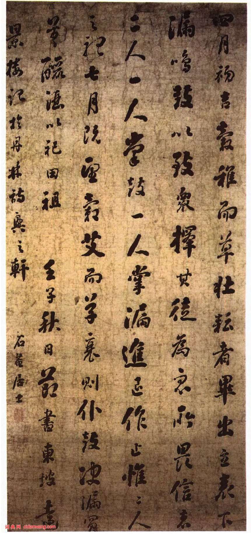 釋文: 四月初吉,穀稚而草壯,耘者畢出。立表下漏,嗚鼓以致眾。擇其徒為眾所畏信者二人, 一人掌鼓, 一人掌漏,進退作止,惟二人之聽。七月既望,穀艾而草衰,則仆鼓決漏,買羊醴酒,以祀田祖。壬子秋日,節書東坡遠景樓,記於丹林詩興之軒,石菴居士。