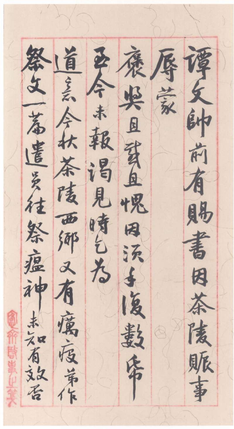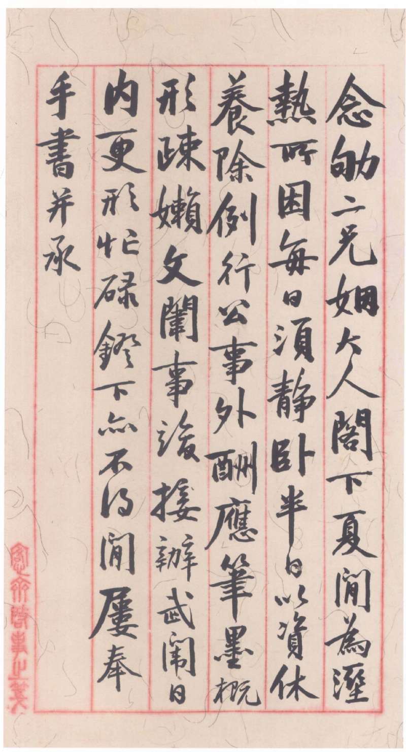 此行書手札,通篇遣筆白然流暢,書體近似曾國藩,頗有黃山谷的趣味;筆法蒼辣穩健,字型剛毅平實,格調淵雅朴茂。吳氏的精湛書藝,給人以清逸遒美、古意繚繞、明快流麗之感。