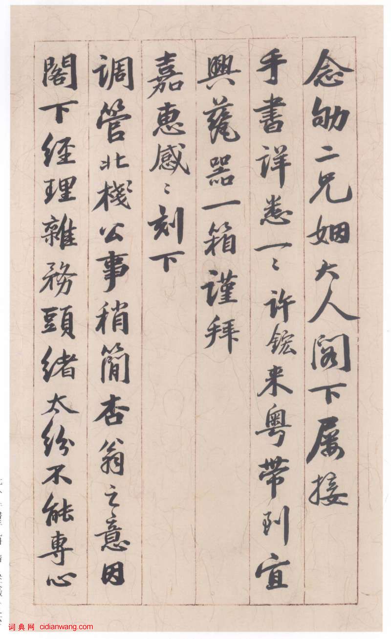 書法欣賞魏晉書法唐朝書法宋朝書法元朝書法明朝書法清朝書法近現代書法字典網>> 歷代書法>> 清朝>> 吳大澂《行書手札》(3)正文 吳大澂《行書手札》(3)作者:吳大澂 書體:行書 首 頁 上一頁 1 2 3 4 5 6 7 8 9 10 下一頁 尾 頁吳大澂的相關書法作品:吳大澂《行書手札》 吳大澂《篆書知過論軸》 吳大澂行書手札 吳大澂篆書《集石鼓文樹古水流八言聯》 吳大澂行書《書示嶽麓書院肄業諸生手帖》 吳大澂篆書《從善有懷八言聯》 吳大澂《篆書白鶴泉銘》 吳大澂篆書《臨段敦(簋)》 吳大澂行書《致大兄書札》 相關文章:饒介《行書七言律詩二首》 (行書)饒介《書七言律詩二首》紙本行書 24.5×49.1cm 台北故宮博物院 ...東漢隸書《幽州書佐秦君石闕》 (隸書)《幽州書佐秦君石闕》拓片 此石1964年出土於北京西郊石景山。無年月,存陽文“漢...文徵明行草《胡笳十八拍》 (行草)文徵明行草作品欣賞《胡笳十八拍》,《胡笳十八拍》是唐代劉商創作的一首古琴曲法,文...北魏《東陽王元榮時期寫經》 (楷書)太和十二年寫本 北魏時期,國家帶動全民信仰佛教,其間雖然發生了太武帝拓拔燾滅佛事...鮮于樞行草《醉時歌等唐人詩十二首》 (行草)鮮于樞冊頁行書《醉時歌等唐人詩十二首》,台北故宮博物院藏。《醉時歌等唐人詩十二首...鄧石如隸書《琴伴衣無五言聯》 (隸書)鄧石如《琴伴衣無五言隸書聯》 立軸 水墨紙本 127.6×27.3cm×2 ...鍾紹京·靈飛經 (小楷)《靈飛經四十三行墨跡本》,美國紐約大都會藝術博物館藏,每頁20.8×8.9cm...實用《西狹頌》集聯《西狹頌》全稱《漢武都太守漢陽阿陽李翕西狹頌》,亦稱《李翕頌》《黃龍碑》,位於甘...張即之行書《致尊堂太安人尺牘》 (行書)張即之《致尊堂太安人尺牘》冊 紙本(牙色印花粉箋) 行書 29.5×47.2c...書法欣賞三步曲,怎么欣賞書法在很多人看來,書法高深莫測,覺得是內行人的事,其實,書法是全中國人的事,你可以不...