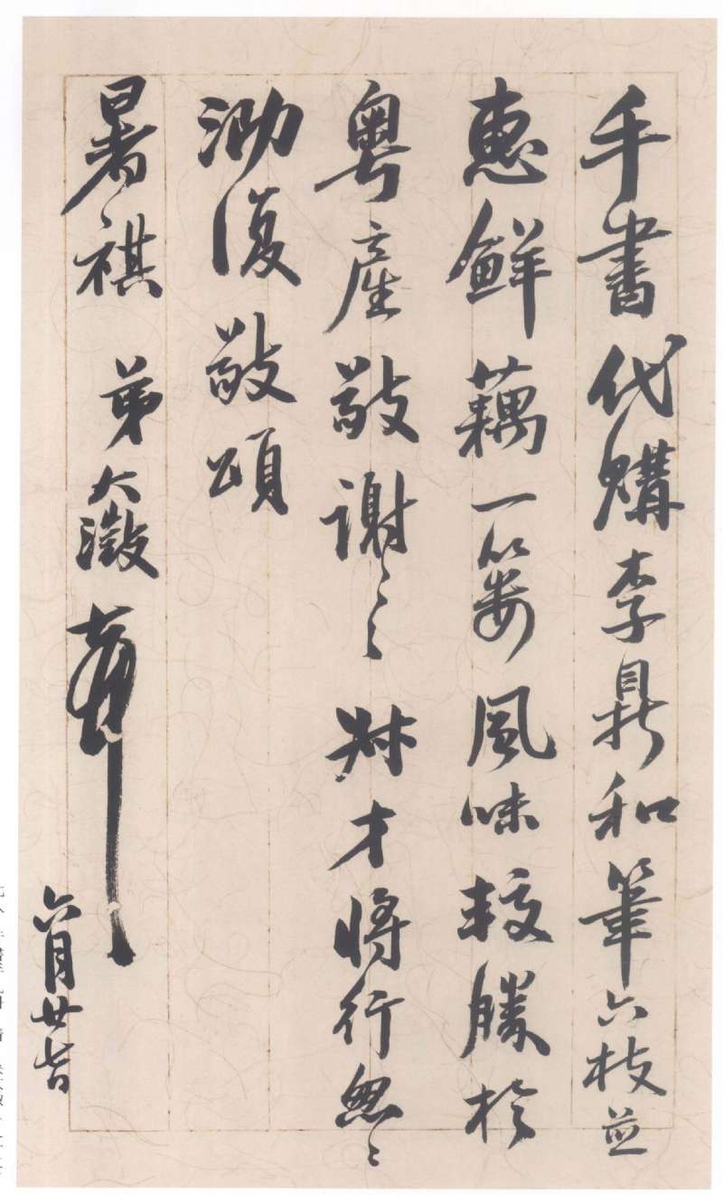 書法欣賞魏晉書法唐朝書法宋朝書法元朝書法明朝書法清朝書法近現代書法字典網>> 歷代書法>> 清朝>> 吳大澂《行書手札》(6)正文 吳大澂《行書手札》(6)作者:吳大澂 書體:行書 首 頁 上一頁 2 3 4 5 6 7 8 9 10 11 下一頁 尾 頁吳大澂的相關書法作品:吳大澂行書《致大兄書札》 吳大澂《篆書知過論軸》 吳大澂篆書《從善有懷八言聯》 吳大澂行書《書示嶽麓書院肄業諸生手帖》 吳大澂篆書《李公廟碑》 吳大澂《行書手札》 吳大澂《篆書白鶴泉銘》 吳大澂篆書《集石鼓文樹古水流八言聯》 吳大澂行書手札 相關文章:張鳳翼·題《李思訓碑》 (行書)張鳳翼題《李思訓碑》,行書。張雨行書《登南峰絕頂七言律詩軸》 (行書)張雨《登南峰絕頂七言律詩軸》 紙本 108.4×42.6cm 無紀年 台北故宮...趙孟頫行書《致景亮書冊》 (行書)趙孟頫致景亮書冊,中國國家博物館藏。縱:24厘米 橫:11.5厘米此件文物為紙...蘇洵《道中帖》 (行草)【釋文】洵頓首再拜 昨日道中草草上記 方以為懼 介使罪來 伏奉教翰 所以眷藉勤厚...楊法《篆書軸》 (篆書)楊法《篆書軸》 紙本 70×41cm 乙丑(1745)年作上海朵雲軒 2010...張雨《寄彝齋、雲林諸公五言詩札》 (小楷)張雨《寄彝齋、雲林諸公五言詩札》 紙本 上29.3×34.1cm 下29.1x...衛夫人小楷《近奉帖》 (小楷)衛夫人《近奉帖》 又名《稽首和南帖》載於淳化閣帖游相本清晰版釋文:“衛稽首和南。...米芾行書《蕭閒堂記》附題跋 (行書)《行書蕭閒堂記書冊》,宋代,米芾,紙本,冊頁,並跋共26頁,每頁縱91.5厘米,...唐寅 漫興墨跡 (行書)《唐寅漫興墨跡》是其為友人所書的自作漫興詩,通卷千餘字一氣呵成,用筆精到細膩,體...魯迅《錄司馬相如大人賦贈章矛塵孫斐君》 (行書)魯迅《錄司馬相如大人賦贈章矛塵孫斐君》 15×9.3cm 1927年 北京魯迅...