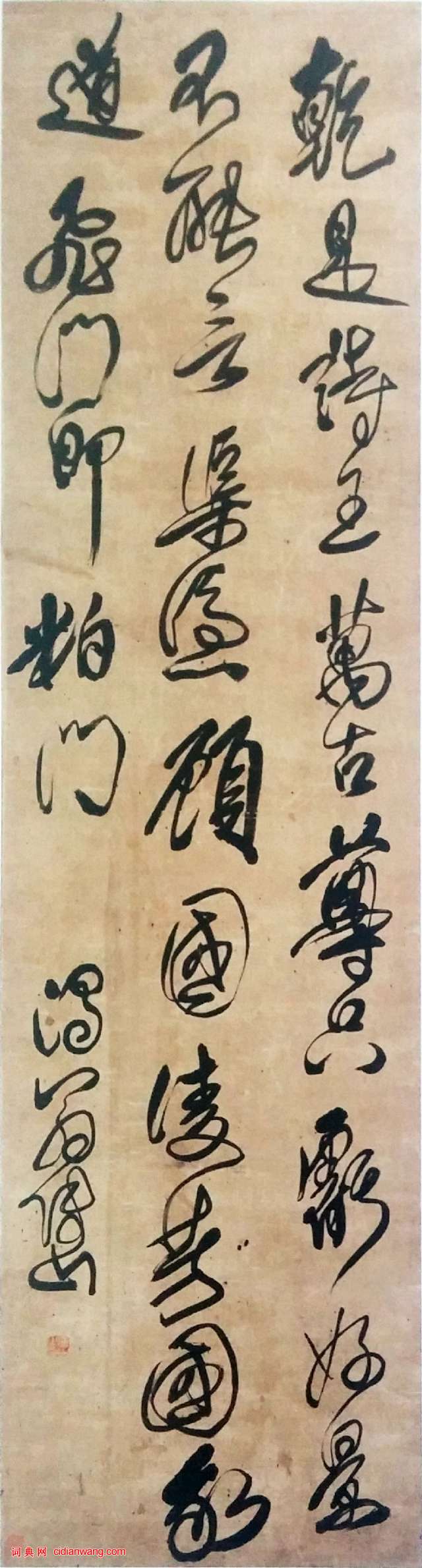 書法欣賞魏晉書法唐朝書法宋朝書法元朝書法明朝書法清朝書法近現代書法字典網>> 歷代書法>> 清朝>> 傅山《行草書七絕一首》正文 傅山《行草書七絕一首》作者:傅山 書體:行草 傅山《行草書七絕一首》綾本立軸 185×51cm 福建博物院藏 釋文:乾是詩王萬古尊,只虧好景不能言。渠憑顧國凌芳國,我道飛門即粕門。濁翁傅山。【資料來源】《福建博物院書畫藏品選粹》(文物出版社) 傅山的相關書法作品:傅山《行草臨帖書冊》 傅山小楷《五言詩》扇面 傅山《草書李白秋登宣城謝脁北樓詩》 傅山《草書孟浩然詩卷》 傅山行草《聰明睿智》軸 傅山《草書五言詩》 傅山《草書憑高瞰迥天怡心七言詩帖》 傅山行草《丹楓閣記》臨本 傅山行書杜甫《和賈舍人早朝詩、賈舍人早朝大明宮詩》 相關文章:傅山《草書臨柳公權聖慈帖》 (草書)傅山 《草書臨柳公權聖慈帖》軸 綾本 134cm×53cm 山西省博物院藏...吳熙載《隸書蓋聞經國》 (隸書)吳熙載《隸書蓋聞經國》十二屏 紙本 149×38.5cm×12 鹹豐 庚申...林散之行書《舉杯嚼雪五言聯》 (行書)林散之《舉杯嚼雪五言聯》紙本行書 1978年作 浦口求雨山文化名人紀念館-林散之...沈度·敬齋箴冊 (小楷)沈度《敬齋箴冊》,楷書,縱23.8cm,橫49.4cm。北京故宮博物院藏。款署“...黃庭堅行書《致無咎通判學士帖》 (行書)黃庭堅《致無咎通判學士帖》(《南康帖》) 紙本行書 30.8×64.7cm 台...田英章《大楷九成宮醴泉銘》 (楷書)《九成宮醴泉銘》(簡稱《醴泉銘》、《九成宮》、《九成宮碑》),是唐初的一座名碑,...左宗棠篆書《誼而恭近六言聯》 (篆書)左宗棠《篆書“誼而恭近”六言聯》 122.5×28.5×2 湖南省博物館藏釋...文徵明行書手卷 (行書)文徵明行書手卷 長 335厘米,高26厘米,紙本 西安碑林博物館藏圖片來自西安碑...朱耷《草書題畫詩軸》 (草書)朱耷《草書題畫詩軸》紙本草書 123.9×47.2cm 首都博物館藏釋文:月川...汪士慎隸書《錄元韓性過天衣寺詩軸》 (隸書)汪士慎《隸書錄元韓性過天衣寺詩軸》紙本隸書 140×35.5cm 濟南市博物館...