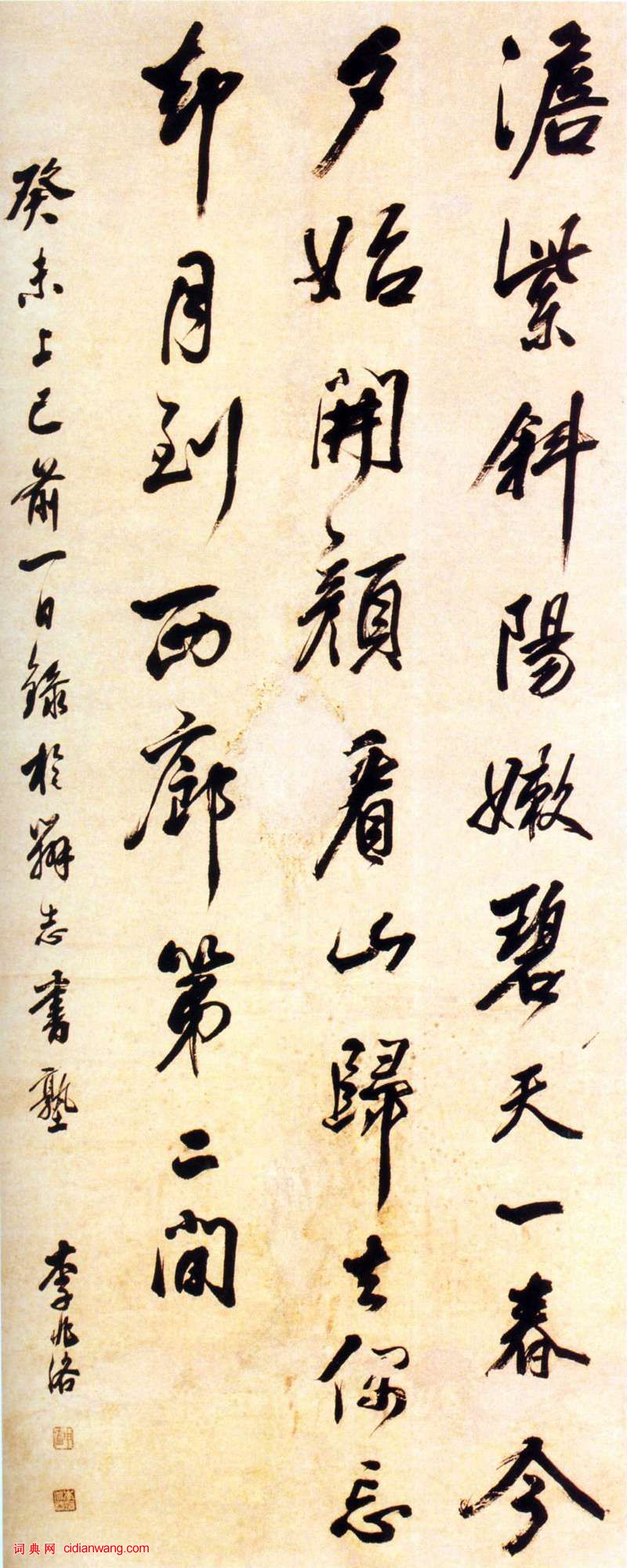 釋文:澹紫斜陽嫩碧天,一春今夕始開顏。看山歸去偶忘卻,月到西廊第二間。——癸未上巳前一日,錄於辨志書塾。李兆洛。