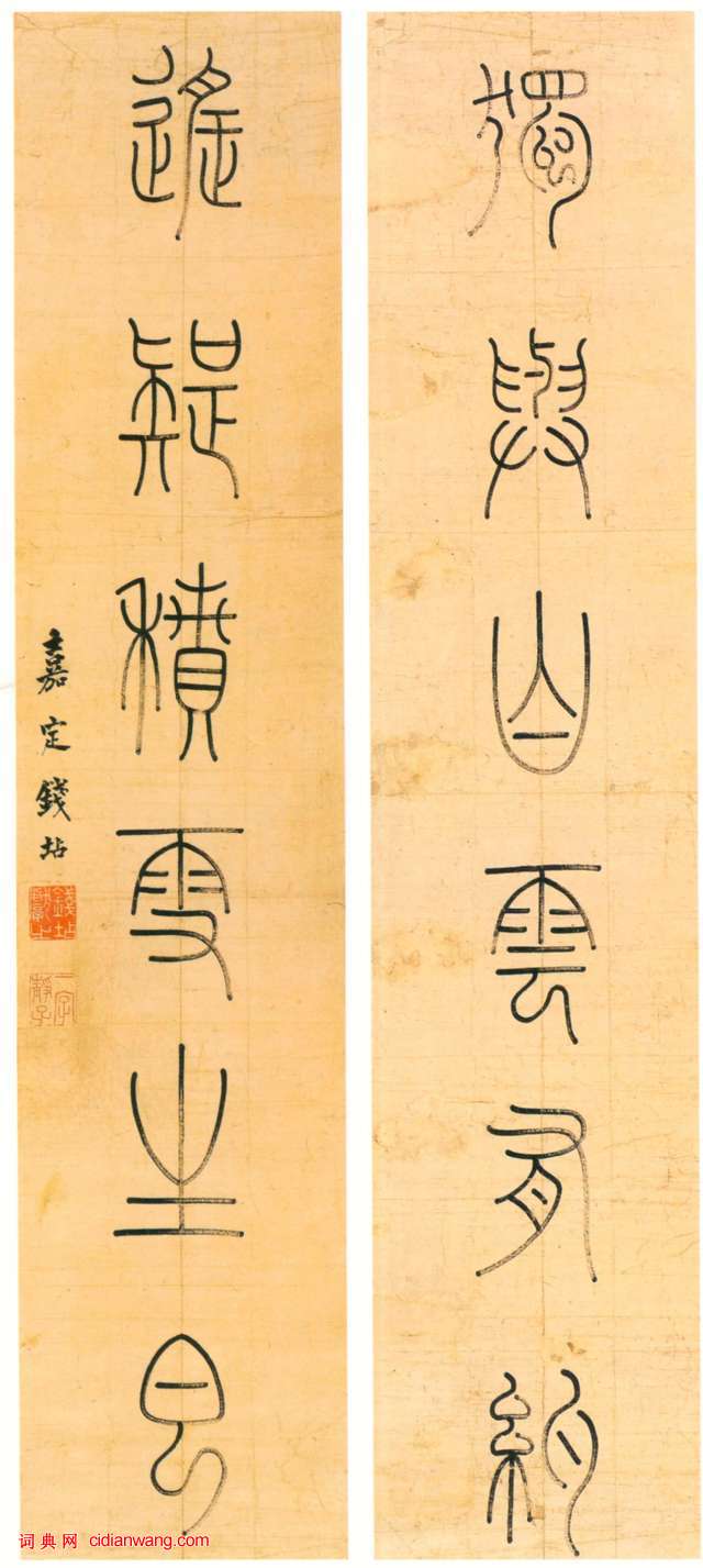 書法欣賞魏晉書法唐朝書法宋朝書法元朝書法明朝書法清朝書法近現代書法字典網>> 歷代書法>> 清朝>> 錢坫《篆書獨與遙疑六言聯》正文 錢坫《篆書獨與遙疑六言聯》作者:錢坫 書體:篆書 錢坫《篆書獨與遙疑六言聯》 115×30cm×2 嘉定博物館藏釋文:獨與白雲有約 遙疑積雪生香。嘉定錢坫。【資料來源】《嘉定博物館館藏書畫篆刻》 錢坫的相關書法作品:錢坫《篆書獨與遙疑六言聯》 錢坫《篆書菩薩蠻詞》軸 相關文章:褚遂良《倪寬贊》 (楷書)褚遂良《倪寬贊》,楷書 24.6x170.1厘米。台北故宮博物院藏。《倪寬贊》傳...米芾行書《蕭閒堂記》附題跋 (行書)《行書蕭閒堂記書冊》,宋代,米芾,紙本,冊頁,並跋共26頁,每頁縱91.5厘米,...周天球楷書《題仇英歸汾圖》 (楷書)周天球《題仇英“歸汾圖”》楷書 縱26.7cm 北京故宮博物院藏釋文:略【資料來...胡適書法作品欣賞 (行楷)胡適,著名學者、詩人,原名嗣穈,學名洪騂,字希疆,後改名胡適,字適之。 安徽徽...文徵明行草《千字文》 (行草)文徵明行草書法欣賞《千字文》,書於嘉靖乙巳(1545年)八月十日,時文徵明76歲...蘇轍《晚來帖》 (行書)蘇轍《晚來帖》,約1089年(元祐四年),行書,縱24.9厘米,橫19.8厘米,...徐枋《草書七律詩軸》 (草書)徐枋《草書七律詩軸》 151×69.6cm 蘇州博物館藏 釋文:綠波浩浩浣花溪...沈尹默手書詞稿四種 小楷墨跡 《涉江詞》 (小楷)沈尹默手書詞稿四種,1984年初版,僅印4150冊,小楷墨跡《涉江詞》、松壑詞、...沈荃《行書蘭亭後序軸》 (行書)沈荃《行書蘭亭後序軸》綾本行書 237×51cm 山西省博物館藏 釋文:古人以...沈曾植《行書王籍入若耶溪詩軸》 (行書)沈曾植《行書王籍入若耶溪詩軸》灑金紙 行書 107×51.5cm 平湖市博物館...