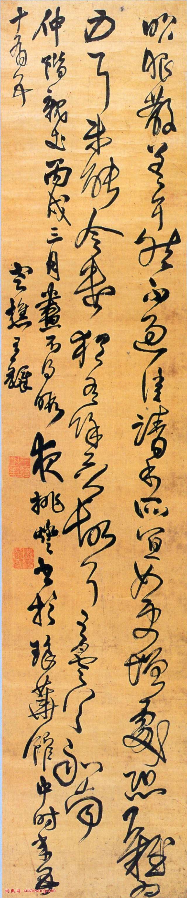 王鐸《臨王曇首昨服散帖》草書絹本, 227×47cm 順治三年(1646) 廣州藝術博物院藏。
