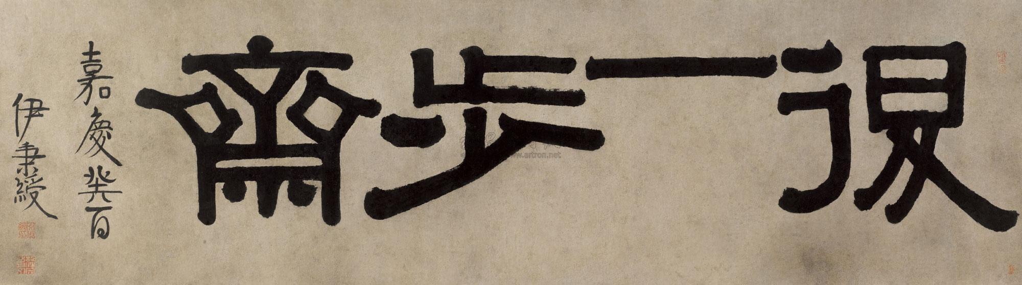 按語:此橫披隸書齋額乃伊秉綬晚年所書之妙筆。此幅書法筆畫粗壯平直,藏頭護尾,凝重古樸,間架溢實,顯得方正雄淳、骨清氣穆。筆畫無晚期漢隸“蠶頭燕尾”,而又帶漢隸碑額之特徵,看似布置均勻,實則富於變化。其行書題款亦融合了篆隸用筆,方圓並施,自成一格,別有韻致。乃為神來之筆。是伊秉綬隸書之典型佳作。