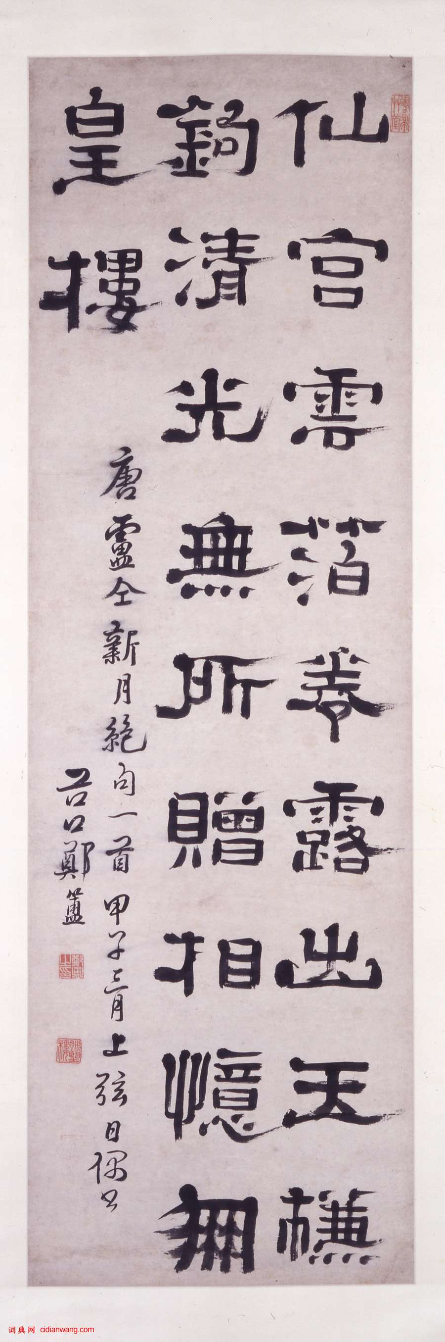 書法欣賞魏晉書法唐朝書法宋朝書法元朝書法明朝書法清朝書法近現代書法字典網>> 歷代書法>> 清朝>> 鄭簠《隸書五言詩》正文 鄭簠《隸書五言詩》作者:鄭簠 書體:隸書 鄭簠《隸書五言詩》 香港藝術館虛白齋藏釋文:仙宮雲箔卷,露出玉簾鉤。清光無所贈,相憶鳳凰樓。題識:唐盧仝新月絕句一首 甲子三月上弦日偶書 谷口 鄭簠資料來源香港中國文化中心網站鄭簠的相關書法作品:鄭簠《隸書蘇軾跋句軸》 鄭簠《隸書五言詩》 鄭簠隸書《古君子行五言詩》 鄭簠隸書《王績望野詩軸》 鄭簠《隸書五言詩》 鄭簠隸書《七律條幅》 相關文章:米芾·淡墨秋山詩帖 (行書)【釋文】淡墨秋山畫遠天,暮霞還照紫添煙。故人好在重攜手,不到平山謾五年。米芾《淡...龔賢《行書經故里詩扇》 (行書)龔賢《行書“經故里”詩扇》 上海博物館藏 釋文:歸來非遠客,下馬淚雙垂。故里宛...9幅趙孟頫書畫題跋 (行楷)9幅趙孟頫書畫題跋欣賞:董其昌《浚路馬湖記》 (行書)《浚路馬湖記》董其昌書,紙本,行書,縱29.3cm,橫607.5cm,132行。...張旭草書《十五日帖》 (草書)《十五日帖》 傳為張芝之作,或是唐代書法家張旭的作品,是一帖難得的草書墨跡。張瑞圖草書《李白獨坐敬亭山詩軸》 (草書)張瑞圖《草書李白獨坐敬亭山詩軸》紙本 126.5×48cm 藏處不詳【釋文】眾...三國《天發神讖碑》拓本 (隸篆)《天發神讖碑》三國吳天璽元年(276年)刻,是吳最後一位君主孫皓因天降符瑞而立碑...何紹基篆書《節錄庾信三月三日華林園馬射賦序四條屏》 (篆書)何紹基《節錄庾信三月三日華林園馬射賦序四條屏》篆書 126.3×31.5 cm...王柏心《行草書詩扇》 (行草)王柏心《行草書詩扇》紙本行草書 17×53cm 湖北省博物館 藏釋文:宋家忠厚...黃姬水草書《七言律詩扇面》 (草書)黃姬水《草書七言律詩扇面》紙本草書 16.5×48.8cm 台北故宮博物院藏 ...