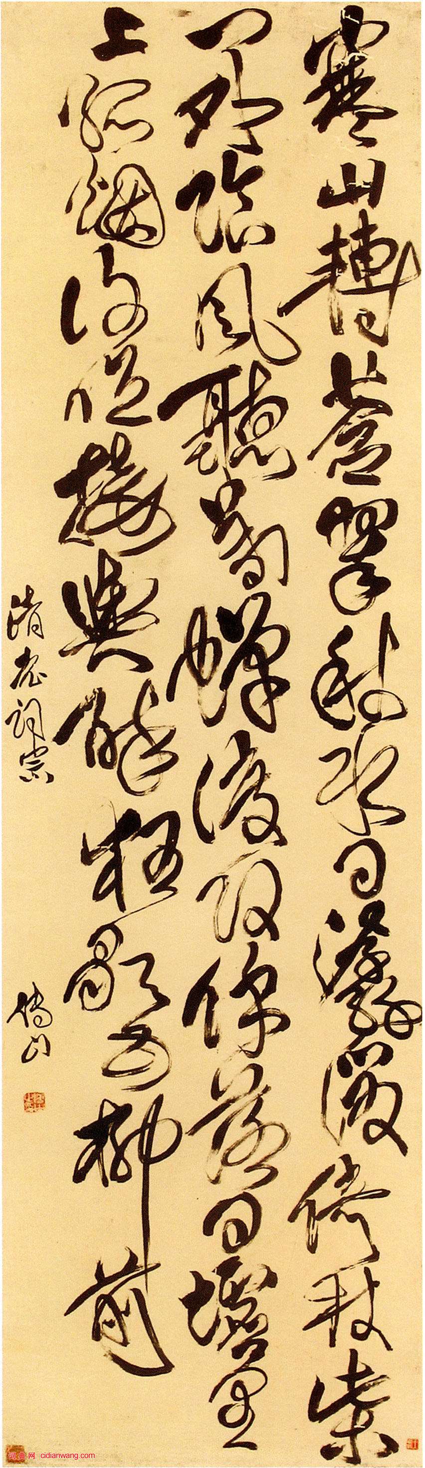 書法欣賞魏晉書法唐朝書法宋朝書法元朝書法明朝書法清朝書法近現代書法字典網>> 歷代書法>> 清朝>> 傅山草書《王維輞川閒居贈裴秀才迪詩》軸正文 傅山草書《王維輞川閒居贈裴秀才迪詩》軸作者:傅山 書體:草書 傅山《王維輞川閒居贈裴秀才迪詩》軸 綾本 186.5x52cm 重慶三峽博物館藏釋文:寒山轉蒼翠,秋水日潺湲。倚杖柴門外,臨風聽暮蟬。渡頭余落日,墟里上孤煙。復值接輿醉,狂歌五柳前。清老詞宗,傅山。傅山的相關書法作品:傅山《草書八屏》軸 傅山《草書杜甫與鄠縣源大少府宴渼陂詩》 傅山《草書杜甫夔州歌十絕句之四詩》 傅山《草書李白秋登宣城謝脁北樓詩》 傅山楷書《竹雨茶煙聯》 傅山《草書右軍大醉七言詩軸》 傅山草書《杜甫對雨書懷走邀許十一簿公詩》 傅山《右軍大醉詩軸》 傅山《草書虹巢》詩軸 相關文章:虞世南楷書集字唐詩《虞世南楷書集唐詩》是(2010年4月1日)西泠印社出版社出版的圖書。帖中的範字...張瑞圖行書《五絕詩》軸 (行書)張瑞圖《五絕詩》軸 紙本 172.7×43.5cm 北京故宮博物院藏【釋文】...米芾行草《樂兄帖》 (行草)米芾《樂兄帖》 紙本 行草書 縱29厘米 橫66厘米 釋文: 芾頓首啟。乃者忝 ...吳雲·跋《爨龍顏碑》 (隸書)吳雲跋《爨龍顏碑》,隸書。李邕楷書《盧正道碑》墨拓 (楷書)李邕《盧正道碑》墨拓 193×97cm 中國國家圖書館藏《東林寺碑》 自署立於...龔鼎孳《行書七絕詩軸》 (行書)龔鼎孳《行書七絕詩軸》綾本行書 272×47cm 安徽省博物館藏 釋文:棗花香...駱秉章楷書《天地文章七言聯》 (行草)駱秉章《楷書“天地文章”七言聯》 129×30cm×2 湖南省博物館藏釋文:...顏真卿楷書《自書告身帖》 (楷書)顏真卿楷書《自書告身帖》,傳本,自署書於建中元年(780年)八月二十八日。楷書,...米漢雯《行書七律詩軸》 (行書)米漢雯《行書七律詩軸》絹本行書 216×63.8cm 天津博物館藏 釋文:水晶...王寵草書《石湖八絕詩卷》 (草書)王寵 石湖八絕詩卷 30cm×307cm 紙本 美國波士頓博物館藏 釋文:石湖...