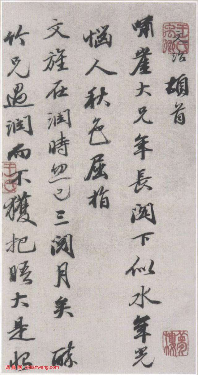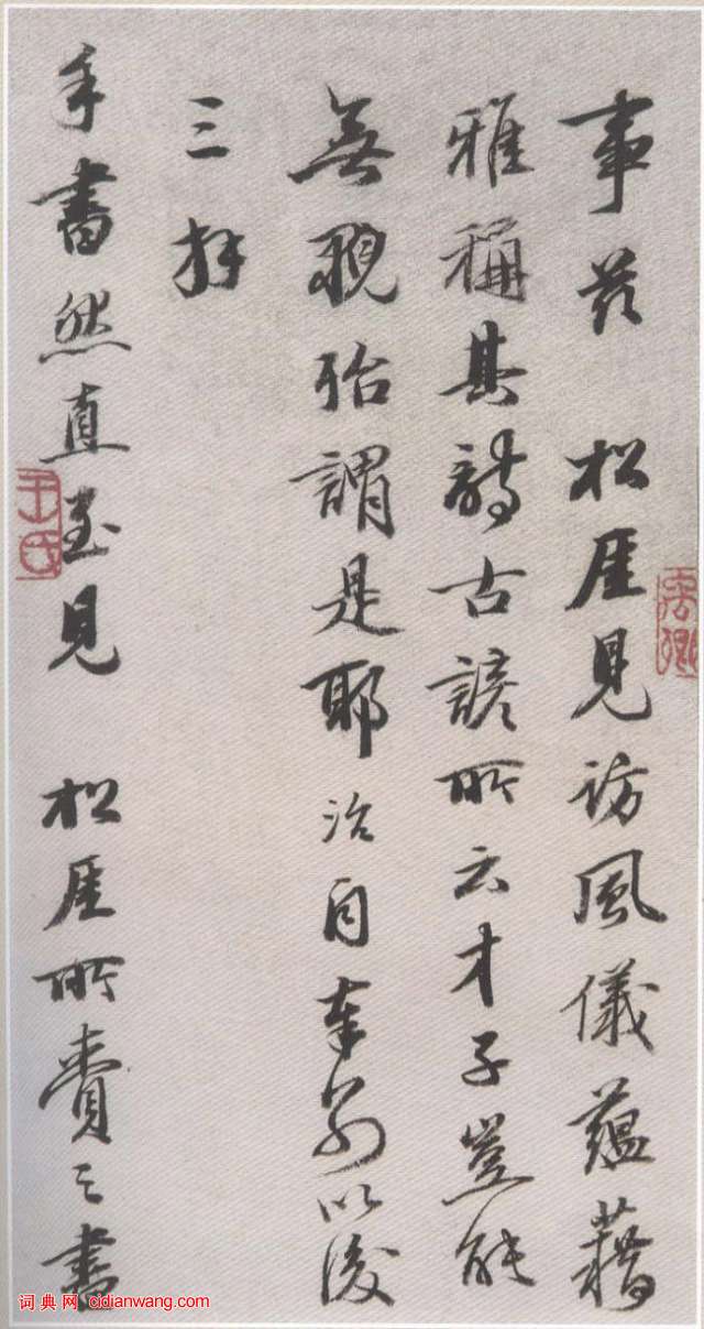 王文治字禹卿,號夢樓。江蘇丹徒(今江蘇省鎮江市)人。十二歲便吟詩作書,詩有唐人風範,書學米、董、後法二王,得力李北海,喜用淡墨。乾隆35年(1770)探花,時稱“淡墨探花”、“淡墨翰林”,與喜用濃墨的劉墉成鮮明對照,其書名與劉墉齊。與姚鼐交往甚密。