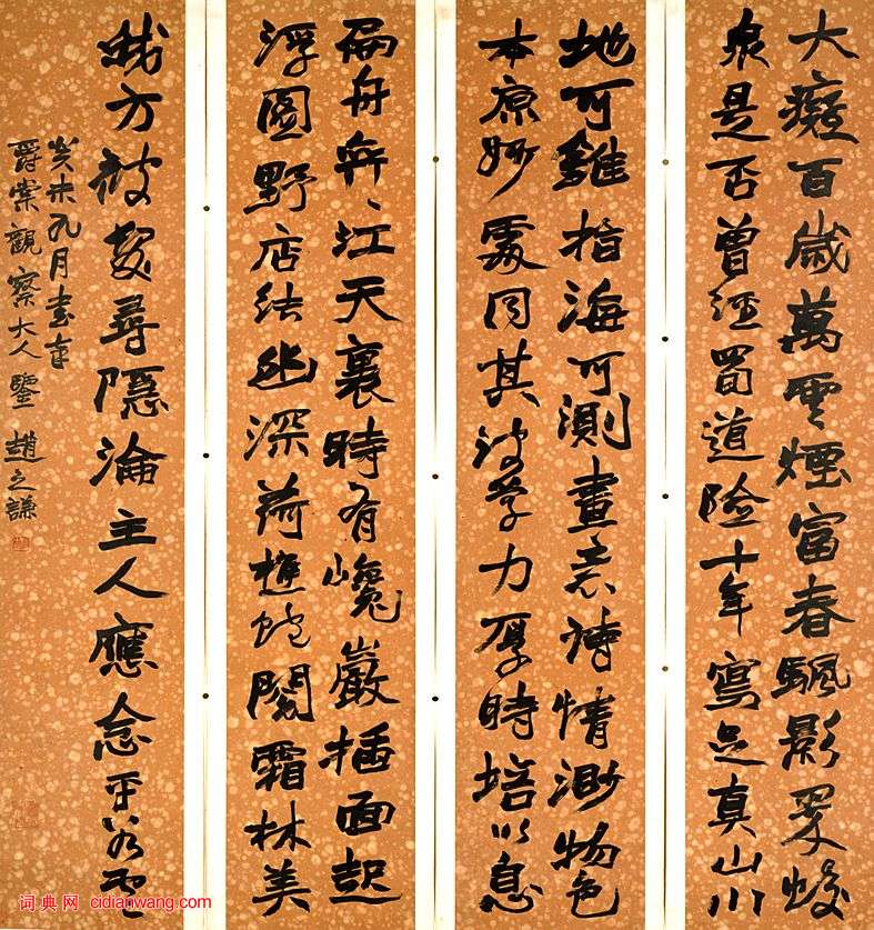 書法欣賞魏晉書法唐朝書法宋朝書法元朝書法明朝書法清朝書法近現代書法字典網>> 歷代書法>> 清朝>> 趙之謙《行書七言古詞四屏》正文 趙之謙《行書七言古詞四屏》作者:趙之謙 書體:行書 趙之謙《行書七言古詞四屏》 虎斑箋 各縱166.0cm 橫34.0cm 日本東京國立博物館藏(高島菊次郎氏寄贈)趙之謙的相關書法作品:趙之謙《書畫扇面合景軸——隸書扇面》 趙之謙《楷書憩雲槎橫幅》 趙之謙《行書搖筆題詩七言聯》 趙之謙《楷書廣成頌軸》 趙之謙《書畫扇面合景軸設色芍藥扇面》 趙之謙《行書錄東坡詩句軸》 趙之謙行書《致艾臣書札》 趙之謙《行書五言詩紈扇》 趙之謙《篆書萬物七情七言聯》 相關文章:《九成宮醴泉銘》臨習指導 (楷書)基本筆畫筆法分析 漢字的基本點畫有點、橫、撇、捺、豎、折、鉤、挑,其它無論多么復...顏真卿楷書《顏氏家廟碑》 (楷書)碑陽篆額及碑陰楷額 顏真卿《顏氏家廟碑》建於建中元年(780年)。楷書,碑文一通...故宮牌匾,猜猜出自誰的手筆?書法家:故宮大殿上的匾額書法,集中反映了封建帝制的最高治國理想和策略。這些書法,...王穉登·跋蘇軾《治平帖》 (楷書)王穉登跋蘇軾《治平帖》,楷書,縱29.2cm。北京故宮博物院藏。康有為行書《五言聯》 (行書)行書五言聯 左右各縱 162厘米,紙本 西安碑林博物館藏資料來自西安碑林博物館蔡襄《腳氣帖》 (行草)【釋文】仆自四月以來,輒得腳氣發腫,入秋乃減,所以不辭北行,然於湖山佳致未忘耳。...祝允明小楷《遠遊二首》 (小楷)祝允明小楷《遠遊二首》冊頁明代書家雖以行草為主,但莫不兼善小楷,如宋克、祝允明、...張瑞圖行書《“尋幽并轡入仙家”七言律詩軸》 (行書)張瑞圖《“尋幽并轡入仙家”七言律詩軸》綾本行書 303×77cm 戊辰(162...東漢隸書《孫仲隱墓誌》 (隸書)東漢隸書《孫仲隱墓誌》 山東高密新發現漢《孫仲隱墓誌》作者:於書亭 李儲森 公...魯迅行書《韋素園墓記》 (行書)魯迅《韋素園墓記》 144×68.7cm 1934年 北京魯迅紀念館藏釋文: ...