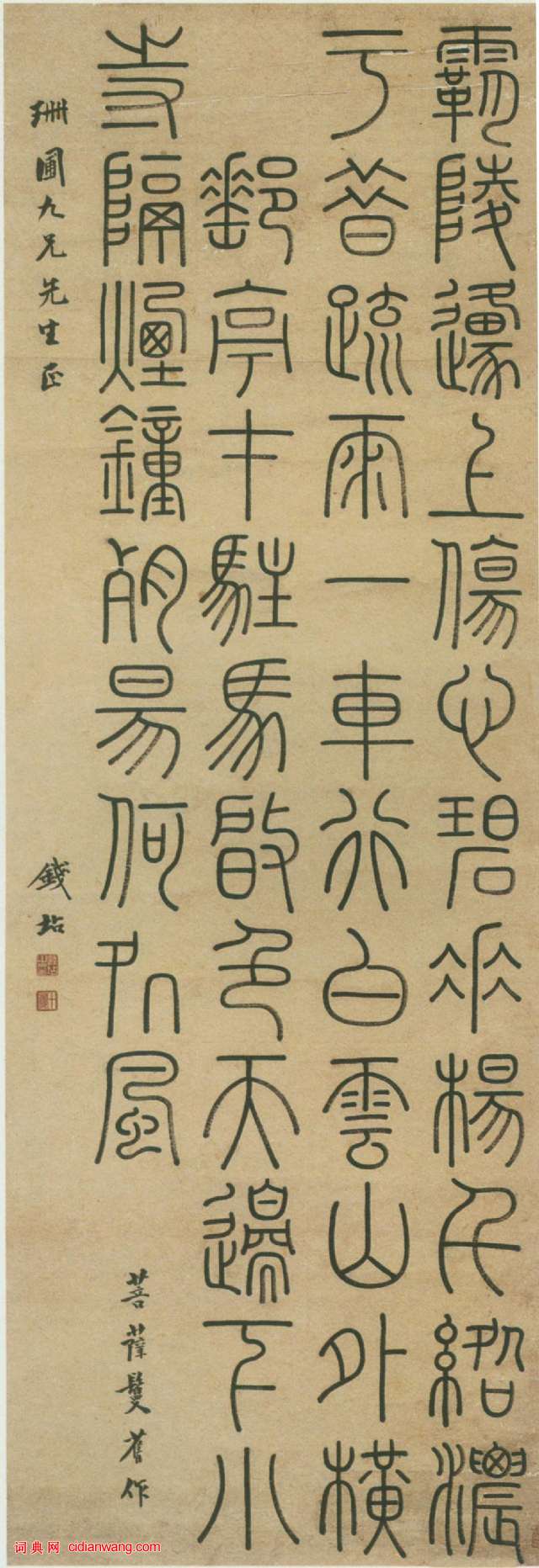 書法欣賞魏晉書法唐朝書法宋朝書法元朝書法明朝書法清朝書法近現代書法字典網>> 歷代書法>> 清朝>> 錢坫《篆書菩薩蠻詞》軸正文 錢坫《篆書菩薩蠻詞》軸作者:錢坫 書體:篆書 錢坫《篆書菩薩蠻詞》軸 紙本 篆書 169.5X57cm 西泠印社藏資料來自《西泠印社百年社藏精品》(西泠印社出版社) 錢坫的相關書法作品:錢坫《篆書獨與遙疑六言聯》 錢坫《篆書菩薩蠻詞》軸 相關文章:沈曾植《草行楷團扇四屏》 (行草)沈曾植《草行楷團扇四屏》絹本 19.5×19.5cm×4 浙江省博物館藏 釋...柳公權楷書《金剛經》拓本 (楷書)柳公權《金剛經》唐拓,法國巴黎博物院藏《金剛經》刻於唐長慶四年(824)四月,系...趙孟頫行書《洛神賦》 (行書)《洛神賦》卷 紙本,行書,縱29cm,橫220.9cm。北京故宮博物院藏全卷共8...趙孟頫臨《定武蘭亭序》 (行書)至大三年(公元一三一○),五十七歲的趙孟頫終於得到了僧獨孤所贈的定武蘭亭帖拓本...趙佶楷書題《瑞鶴圖卷》 (楷書)《瑞鶴圖》是公認的宋徽宗存世工筆寫實類花鳥畫真跡,為存世絕少的宋徽宗“御筆畫”。...法式善《行書七古詩軸》 (行書)法式善《行書七古詩軸》紙本行書 108.5×57cm 北京文物商店藏釋文: 朱...雅琥楷書《跋董源夏景山口待渡圖詩一首》 (楷書)雅琥《跋董源“夏景山口待渡圖”詩一首》 紙本楷書 縱49.8cm 遼寧省博物館藏...黃庭堅行書《寒山子龐居士詩帖》 (行書)黃庭堅《寒山子龐居士詩帖》 (高清版)《寒山子龐居士詩帖》是黃庭堅晚年傑作,落筆...張瑞圖行草《書李白夢遊天姥吟留別詩冊》 (行草)張瑞圖《書李白夢遊天姥吟留別詩冊》 紙本行草書 25.7×30.5cm×14...北魏《魏故世宗宣武皇帝嬪墓誌》 (楷書)北魏《魏故世宗宣武皇帝嬪墓誌》,孝昌二年八月六日立。 銘文: 魏故世宗宣武皇帝...