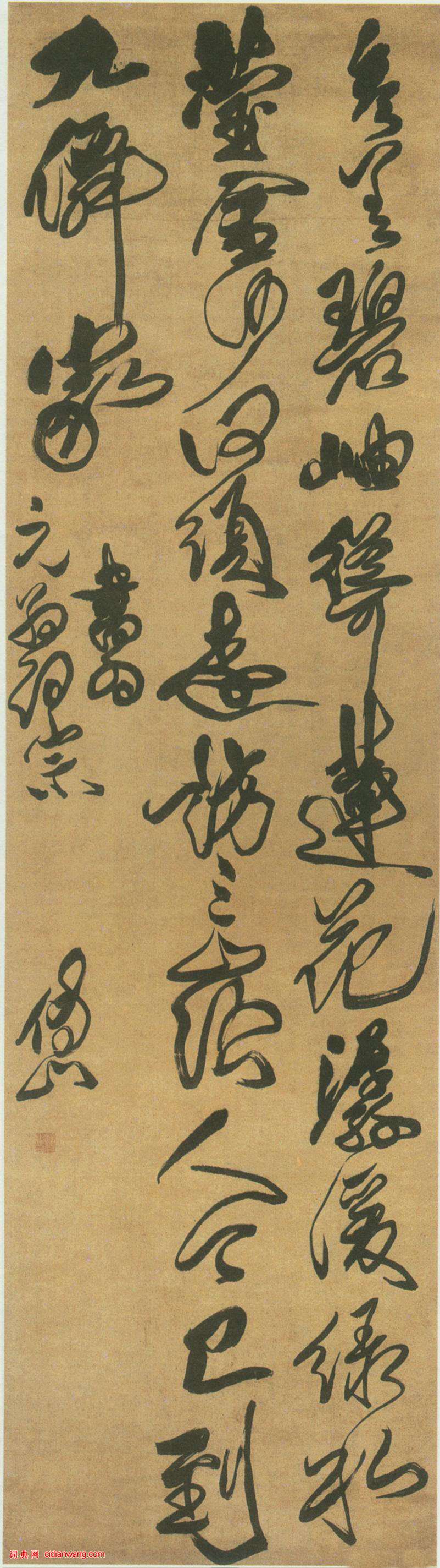 書法欣賞魏晉書法唐朝書法宋朝書法元朝書法明朝書法清朝書法近現代書法字典網>> 歷代書法>> 清朝>> 傅山《草書七言絕句立軸》正文 傅山《草書七言絕句立軸》作者:傅山 書體:草書 傅山《草書七言絕句立軸》 軸 絹本 縱178.5cm 橫49cm 西泠印社藏資料來自《西泠印社百年社藏精品》(西泠印社出版社)傅山的相關書法作品:傅山草書臨王羲之《闊轉久帖》 傅山《草書孟浩然詩卷》 傅山草書《晉公千古一快四條屏》 傅山《草書七絕詩屏》軸 傅山《草書臨冠軍帖》 傅山《草書軸》 傅山小楷《心經》 傅山草書《王公昨夜詩》軸 傅山《草書臨王羲之明府帖》 相關文章:他們的狂,成就了書法的狂【導讀】王獻之被謝安問:“你和你爸爸的書法,哪個更好?”王獻之說:“當然是我。”...王羲之·姨母帖 (行楷)【釋文】十一月十三日,羲之頓首、頓首。頃遘姨母哀,哀痛摧剝,情不自勝。奈何、奈何...蘇軾《寒食帖》,蘇軾黃州寒食帖 (行書)《寒食帖》又名《黃州寒食詩帖》或《黃州寒食帖》。是蘇軾撰詩並書,墨跡素箋本,橫3...張旭《肚痛帖》神一樣的存在! (草書)唐代文宗皇帝李昂曾下詔書,以李白的詩歌、裴旻的劍舞、張旭的草書為“三絕”,可見書...徐三庚《篆書儀表瑾瑜八言聯》 (篆書)徐三庚《篆書儀表瑾瑜八言聯》 私人藏釋文:儀表外明風神內照,瑾瑜比潔日月爭光。 ...實用《西狹頌》集聯《西狹頌》全稱《漢武都太守漢陽阿陽李翕西狹頌》,亦稱《李翕頌》《黃龍碑》,位於甘...民初李海峰楷書《觀音殿記》 (楷書)這是清末民初書家李海峰的作品,商賈為了賺錢才冠以趙孟頫書。李海峰的作品還有“五柳...吳榮光行書《致晴圃書札》 (行書)吳榮光行書《致晴圃書札》 釋文:晴圃五兄大人閣下:自榮光伏處鄉里,一緘布及,心領...啟功小楷《失眠口占小品》 (小楷)啟功老先生的小楷作品,下面的這幾幅算是口占小品,我覺得可能就是他在日常生活中記錄...王羲之·集王聖教序 (行書)全稱《大唐三藏聖教序》。懷仁集王羲之行書而成。唐·鹹亨三年(672)十二月建。...