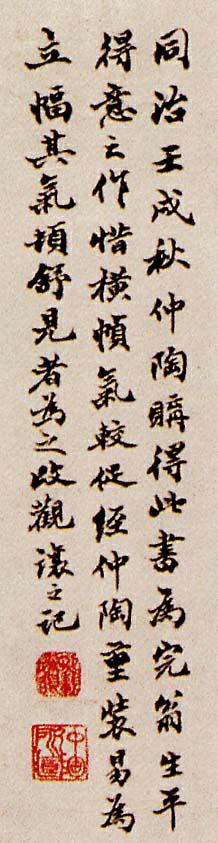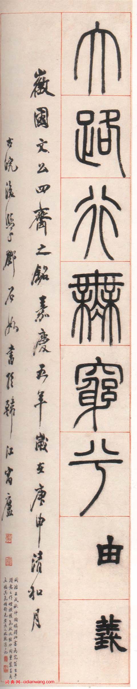 書法欣賞魏晉書法唐朝書法宋朝書法元朝書法明朝書法清朝書法近現代書法字典網>> 歷代書法>> 清朝>> 鄧石如篆書《朱熹四齋銘》(3)正文 鄧石如篆書《朱熹四齋銘》(3)作者:鄧石如 書體:篆書 篆書朱熹四齋銘 吳讓之跋款 首 頁 上一頁 1 2 3 鄧石如的相關書法作品:鄧石如篆書《朱熹四齋銘》 鄧石如篆書《逍遙仿佛七言聯》 鄧石如隸書《世慮全消四幅屏》 鄧石如篆刻作品欣賞 鄧石如篆書七言聯 鄧石如篆書《小窗幽記》節選 鄧石如行草《海龍天鶴五言聯》 鄧石如《四體書冊》之《怪石長松篆書冊》 鄧石如篆書《白氏草堂記六屏》 相關文章:沈荃《行書臨爭座位帖軸》 (行書)沈荃《行書臨爭座位帖軸》綾本行書 238×50cm 天津博物院藏 【資料來源】...書法精論九十條1、眼高者手高,眼低者手低。2、作字先作人,人奇字自古。技巧是血肉,觀念是靈魂。...東漢隸書《白石神君碑》 (隸書)東漢隸書碑刻。陰文篆額題《白石神君碑》。有碑陰題名。光和六年(183)立。碑原在...蔡襄《扈從帖》 (行書)【釋文】襄拜:今日扈從逕歸,風寒侵人,偃臥至晡。蒙惠新萌,珍感珍感!帶胯數日前見...梁漱溟行書《錄林宰平詩一首》 (行書)梁漱溟《錄林宰平詩一首》行書 釋文: 安得胸如海樣寬,瞭然人事著悲歡。水天極...左宗棠行書《少年虛己七言聯》 (行書)左宗棠《行書“少年虛己”七言聯》紙本行書 166.2×38.7cm×2 台北...文徵明行書《月夜觀玉蘭》立軸 (行書)文徵明《月夜觀玉蘭》立軸。瀟灑自然的行書詩軸是文徵明《月夜觀玉蘭》之作,詩文將玉...趙孟頫小楷《道德經》高清版 (小楷)趙孟頫(1254~1322),字子昂,號松雪道人,又號水精宮道人、歐波等,世稱“...顧蓴·跋《唐摹蘭亭序》 (楷書)【釋文】虛和中自饒古拙之趣,宋元諸大家不能追步也。月軒表姊夫精於鑑古,此卷不輕出...王蒙《夢梅花詩卷》 (行草)王蒙《夢梅花詩卷》,行草,北京故宮博物院藏。這是一件最能反映王蒙書法風格的作品。...
