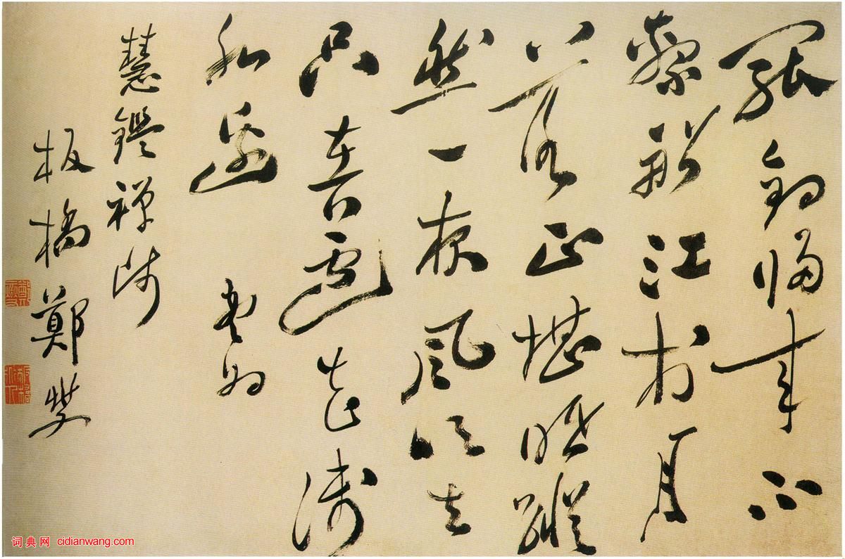 書法欣賞魏晉書法唐朝書法宋朝書法元朝書法明朝書法清朝書法近現代書法字典網>> 歷代書法>> 清朝>> 鄭板橋草書《司空曙七絕》正文 鄭板橋草書《司空曙七絕》作者:鄭板橋 書體:草書 鄭板橋《草書司空曙七絕》 65x100.8cm 南京博物院藏釋文:釣罷歸來不繫船,江村月落正堪眠。縱然一夜風吹去,只在蘆花淺水邊。——書為慧鑒禪師 板橋鄭燮鄭板橋的相關書法作品:鄭板橋《戒子銘》 鄭板橋《滿江紅贈王正子》 鄭板橋草書《司空曙七絕》 鄭板橋行書《東坡小品》 相關文章:唐寅行書自題《秋菊圖》 (行書)唐寅《秋菊圖》軸 紙本水墨,135×55.5cm 天津博物館藏唐寅自題《秋菊圖...查士標·行草詩冊 (行草)查士標《行草詩冊》,上海朵雲軒藏。查士標(1615--1698),字二瞻,號梅壑...鄭燮《行書贈詩軸》 (行書)鄭燮《行書贈詩軸》紙本行書 46×35cm 1753年 北京故宮博物院藏 釋文...唐高宗李治行書《李勣碑》 (行書)唐高宗《李勣碑》,全稱《贈太尉英貞武公李勣碑》,鐫於儀鳳二年(677年)在陝西醴...秦兩詔銅斤權 (篆書)秦兩詔銅斤權,篆書,西安秦始皇陵墓出土,陝西秦始皇兵馬俑博物館藏 【釋文】:元年...倪元璐《節錄左思“蜀都賦”草書軸》 (草書)倪元璐《節錄左思“蜀都賦”草書軸》綾本草書,156.5×49.5cm。日本兵庫...沈藻《黃州竹樓記》 (楷書)【釋文】黃州竹樓記。黃岡之地多竹,大者如椽,竹工破之,刳去其節,用代陶瓦。比屋皆...項元汴·跋王獻之中秋帖 (小楷)項元汴跋王獻之《中秋帖》,小楷,北京故宮博物院藏。龍門二十品《比丘法生造像記》 (楷書)法生造像記拓片簡稱《法生造像》,《比丘法生造像記》,全稱《比丘法生為孝...程邃《行書探梅詩軸》 (行書)程邃《行書探梅詩軸》紙本行書 86.3×46.9cm 上海博物館藏釋 文:野航...
