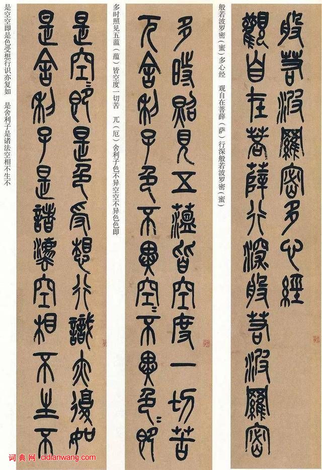 《心經》十二條屏是吳昌碩晚年的扛鼎之作,現藏於日本東京國立博物館。每屏高132.5厘米,寬30.2厘米。大致推算一下,每字約在10厘米見方左右。全篇268字,除開篇“般若波羅密多心經”標題與末行2字之外,其餘各列皆有12字,每一屏下半段右側皆鈐《道在瓦甓》印章。《心經》內容有幾個詞組與單字重複頻率極高,處理起來不容易,縱觀全篇,一氣呵成而無疲態。