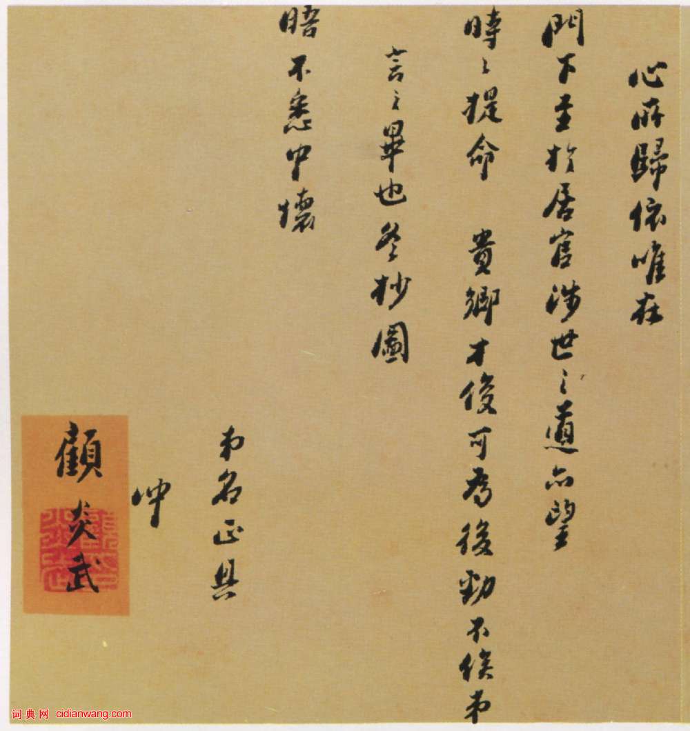 書法欣賞魏晉書法唐朝書法宋朝書法元朝書法明朝書法清朝書法近現代書法字典網>> 歷代書法>> 清朝>> 顧炎武《行書手札》(2)正文 顧炎武《行書手札》(2)作者:顧炎武 書體:行書 首 頁 上一頁 1 2 顧炎武的相關書法作品:顧炎武《行書手札》 顧炎武楷書《恭祝子翁詩扇》 相關文章:林散之《贈朱小平草書脫俗寫生七言聯》 (草書)林散之《贈朱小平草書脫俗寫生七言聯》紙本草書 1976年 釋文:脫俗書成一家法,...趙孟頫楷書《四時讀書樂》 (楷書)《四時讀書樂》 讀書之樂樂無窮,春夏秋冬樂其中。風雨霜雪頻相戲,合窗展卷自從容。...鍾繇《墓田丙舍帖》 (楷書)《墓田丙舍帖》釋文:墓田丙舍,欲使一孫於城西,一孫於都尉府,此繇家之嫡正之良者也...文同·跋范仲淹《道服贊》 (行書)文同跋范仲淹《道服贊》,行書,縱34.8cm,北京故宮博物院藏。吳熙載行書《節臨蘭亭序》扇面 (行書)吳熙載《節臨蘭亭序》扇面 紙本,18.0×52.3cm 日本東京國立博物館藏...顏真卿雅集《竹山堂連句》 (楷書)顏真卿楷書《竹山堂連句》是魯公傳世不多的墨跡之一。雖然這幅作品沒有其他傳世作品的...張瑞圖行楷《送康侯楊外孫北上七篇》 (行楷)張瑞圖《送康侯楊外孫北上七篇》冊 金箋 行楷書 冊頁 每開20.4×13cm...呂大防《示問帖》 (行楷)呂大防《示問帖》,紙本,行楷書,縱27.4厘米,橫44.5厘米。《示問帖》是呂大...趙孟頫行書《洛神賦》 (行書)《洛神賦》卷 紙本,行書,縱29cm,橫220.9cm。北京故宮博物院藏全卷共8...沙孟海《行書蘇軾詩四屏 》 (行書)沙孟海《行書蘇軾詩四屏 》紙本 143×23.5cm×4 1...