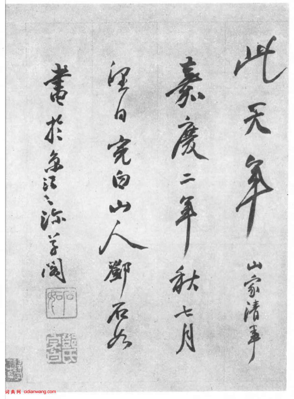 書法欣賞魏晉書法唐朝書法宋朝書法元朝書法明朝書法清朝書法近現代書法字典網>> 歷代書法>> 清朝>> 鄧石如《四體書冊》之《擇故山濱水地行草書冊》(3)正文 鄧石如《四體書冊》之《擇故山濱水地行草書冊》(3)作者:鄧石如 書體:行草 驢四蹄。牛四角。客至具蔬食酒核。暇則讀書。課農圃事。毋苦吟,安此天年。山家清事。嘉慶二年秋七月望日。完白山人鄧石如。書於京江江深草閣。首 頁 上一頁 1 2 3 鄧石如的相關書法作品:鄧石如《四體書冊》 鄧石如行草《海龍天鶴五言聯》 鄧石如篆書《小窗幽記》節選 鄧石如《隸書五律》 鄧石如篆書《朱熹四齋銘》 鄧石如《四體書冊》之《擇故山濱水地行草書冊》 鄧石如隸書《世慮全消四幅屏》 鄧石如《四體書冊之篆書八闥冊》 鄧石如隸書《少學琴書冊》 相關文章:唐棣·跋趙孟頫書《赤壁賦》 (行書)【釋文】東坡二賦,松雪要每一書之,敻出諸書之右,故深得晉人書法。晚年行筆圓熟,度...傅山《各體書冊》 (四體)傅山 《各體書冊》冊 紙本 29cm×15cm×2×12 山西省博物...歐陽詢楷書《皇甫誕碑》修複本 (楷書)歐陽詢楷書《皇甫誕碑》,此碑書法用筆、結體及字形具有北齊風格,骨氣勁峭,法度嚴整...米芾·淡墨秋山詩帖 (行書)【釋文】淡墨秋山畫遠天,暮霞還照紫添煙。故人好在重攜手,不到平山謾五年。米芾《淡...徐渭《行書王維“待儲光羲不至”五律詩軸》 (行書)徐渭《行書王維“待儲光羲不至”五律詩軸》 紙本行書,227cm×105.2cm...洪亮吉行書《七言律詩軸》 (行書)洪亮吉《行書七言律詩軸》紙本行書 62×36cm 南通博物苑藏【資料來源】:《...董其昌《勤政勵學箴》 (楷書)董其昌《楷書勤政勵學箴》,縱214.5厘米,橫61.8厘米,現藏遼寧省博物館。釋...啟功《行書七言對聯》 (行書)釋文:一笑一念一清淨,一花一葉一如來。啟功(1912——2005),自稱“姓啟名...魯迅《行書悼楊銓詩》 (行書)魯迅《行書悼楊銓詩》24.2×27.3cm 1933年 北京魯迅博物館藏釋文:...緬懷啟老:啟功《痛心篇》20首從包辦婚姻到一生知己啟功先生的書畫四海聞名,自不必多言。而他與妻子章寶琛的愛情故...