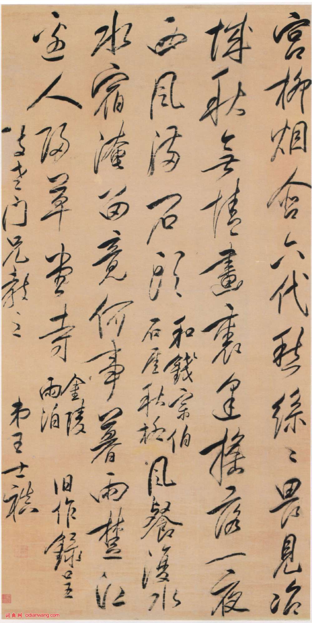 釋文:宮柳煙含六代愁,絲絲畏見冶城秋。無情畫裡逢搖落,一夜西風滿石頭。——和錢宗伯石崖秋柳。