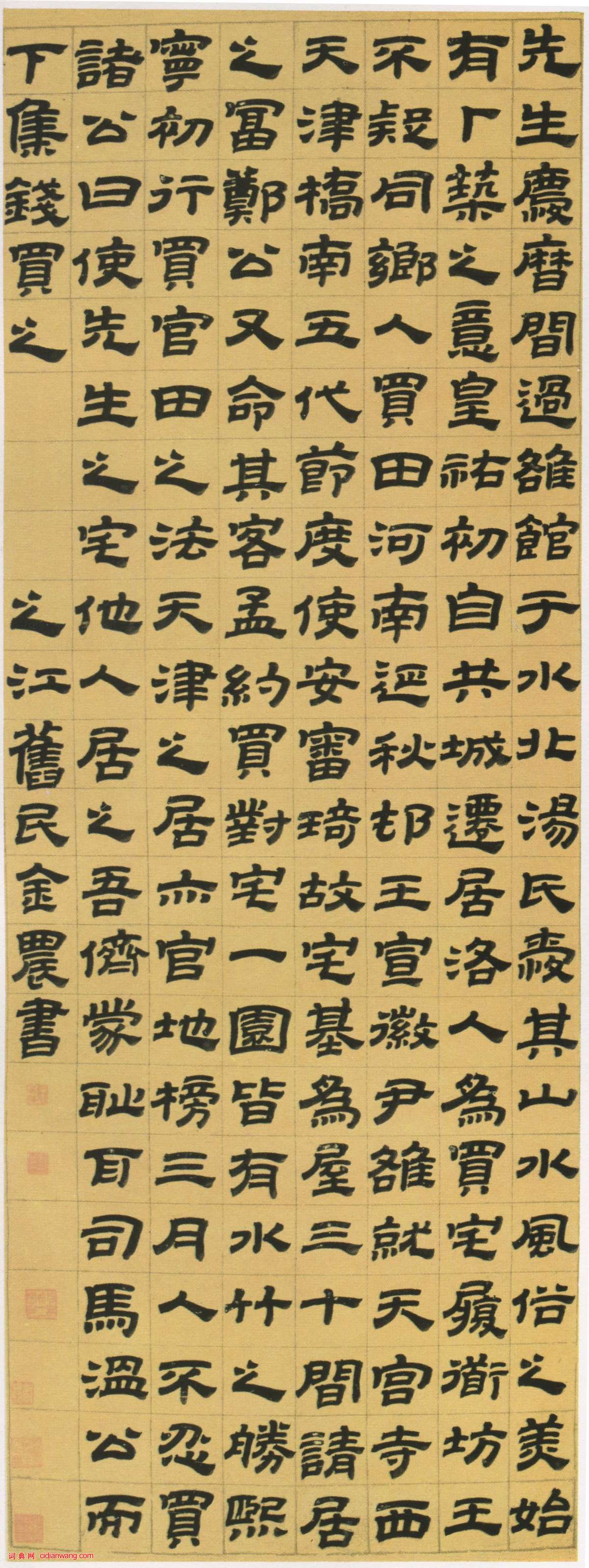 書法欣賞魏晉書法唐朝書法宋朝書法元朝書法明朝書法清朝書法近現代書法字典網>> 歷代書法>> 清朝>> 金農《隸書語摘立軸》正文 金農《隸書語摘立軸》作者:金農 書體:隸書 金農《隸書語摘立軸》絹本隸書 122×45cm 上海朵雲軒藏釋文:(略)款署:之江舊民金農書。【資料來源】《中國美術全集》書法篆刻編-6-清代書法金農的相關書法作品:金農隸書《范石湖先生句》 金農隸書《水樂洞小詩橫披》 金農《隸書軸 》 金農《隸書陳野水事軸》 金農漆書古謠一首 金農漆書七絕軸 金農《隸書語摘立軸》 金農隸書《玉川子嗜茶帖》 金農楷書《九老圖》 相關文章:張瑞圖《行書廣陵三月七絕詩軸》 (行書)張瑞圖《行書廣陵三月七絕詩軸》紙本行書 189×65.5cm 山西省博物館藏釋...傅眉《草書杜甫進艇詩句》軸 (草書)傅眉山西陽曲人,傅山獨子。清代畫家。字壽髦,一作壽毛,又字竹嶺,自號小櫱禪。自幼...虞世南行草《疲朽帖》 (行草)虞世南《疲朽帖》拓本 行草書 25.7×43厘米 《淳化閣帖》卷四收錄 上海博...康有為行書《護世游天五言聯軸》 (行書)康有為《護世游天五言聯軸》 紙本行書 130cm×32cm×2 丙寅(1...狄平子 跋戴進《長江萬里圖》 (行書)狄平子跋戴進《長江萬里圖》,縱34.3厘米。美國克利夫蘭美術館藏。狄平子(187...文徵明 《行書五言律詩》 (行書)文徵明 《行書五言律詩》 紙本立軸 191x72.2cm 台北故宮博物院藏本幅書...黃庭堅行書《酺池寺詩》 (行書)黃庭堅行書《酺池寺詩》小黠大痴螳捕蟬。有餘不足夔憐蚿。退食歸來北窗夢。一江春月趁...總結顏體書法結構16種一、疏、密、大、小字形的布勢1、疏筆畫少的字必疏,遇到撇捺的字,撇短捺長顯示字的...文徵明《長者帖》 (楷書)文徵明《長者帖》,尺牘,楷書,故宮博物院藏。文徵明《行草詩冊》欣賞 (行草)文衡山書法墨跡欣賞《文徵明行草詩冊》,台北故宮博物院藏。 文徵明(1470-15...