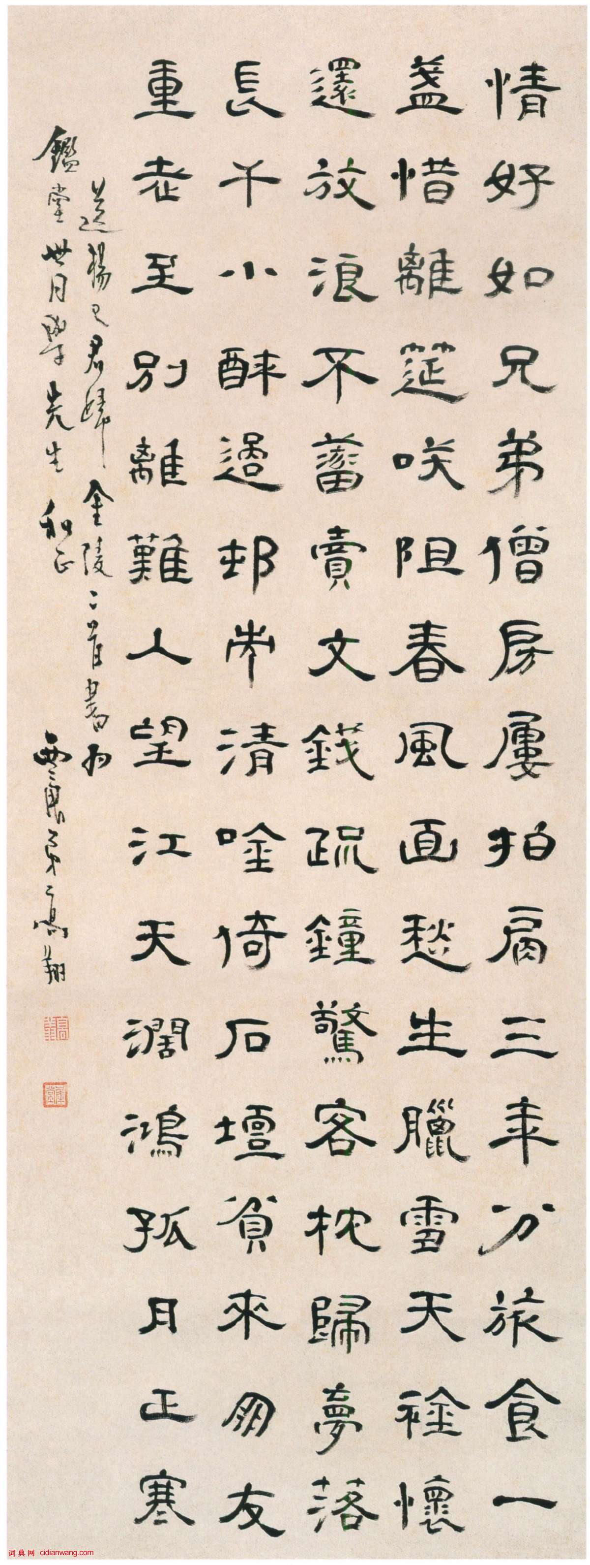 書法欣賞魏晉書法唐朝書法宋朝書法元朝書法明朝書法清朝書法近現代書法字典網>> 歷代書法>> 清朝>> 高翔《隸書送楊已君歸金陵詩軸》正文 高翔《隸書送楊已君歸金陵詩軸》作者:高翔 書體:隸書 高翔《隸書送楊已君歸金陵詩軸》 紙本隸書 94×35cm 安徽省博物館藏 【資料來源】《中國法書全集》-17-清2(文物出版社)高翔的相關書法作品:高翔《隸書送楊已君歸金陵詩軸》 高翔《隸書陶潛飲酒詩軸》 相關文章:王寵草書《送李願歸盤谷序》 (草書)王寵 草書《送李願歸盤谷序》灑金紙本 縱25.8公分 橫1103.6公分 台北故...李文田《行書七律詩軸》 (行書)李文田《行書七律詩軸》 中國國家博物館藏 釋文:..絕塞關山秦上谷,極天嵐采漢軍...王守行書《張桂岩墓志銘》卷 (行書)王守《張桂岩墓志銘》卷 紙本 行書 23 × 234 cm 天津博物館藏【釋...吳熙載篆書《庾信詠屏風詩》 (篆書)1799年生,1870年逝世,原名廷揚,字熙載,五十後以字行,號讓之,亦作攘之,...石濤行書《贈哲翁詩卷》 (行書)石濤《贈哲翁詩卷》紙本行書 29×270cm 無錫市博物館藏 ...三國魏碑《孔羨碑》 (隸書)《孔羨碑》。又名《魯孔子廟碑》、《修孔子廟碑》、《封孔子廟碑》等,刻於三國魏黃初...長沙窯詩文壺《不意多離別》 (行草)行草——青釉褐彩“不意多離別”詩文壺(局部) 殘高13.6厘米 湖南省博物館...文徵明《長者帖》 (楷書)文徵明《長者帖》,尺牘,楷書,故宮博物院藏。倪元璐《草書節錄吳都賦詩軸》 (草書)倪元璐《草書節錄吳都賦詩軸》 北京故宮博物院藏釋文:飲烽起,釂鼓震。士遺倦,眾懷...張照行書《御製讀陶詩卷》 (行書)張照《御製讀陶詩卷》絹本行書 45×264.5cm 台北故宮博物院藏 釋文:風...