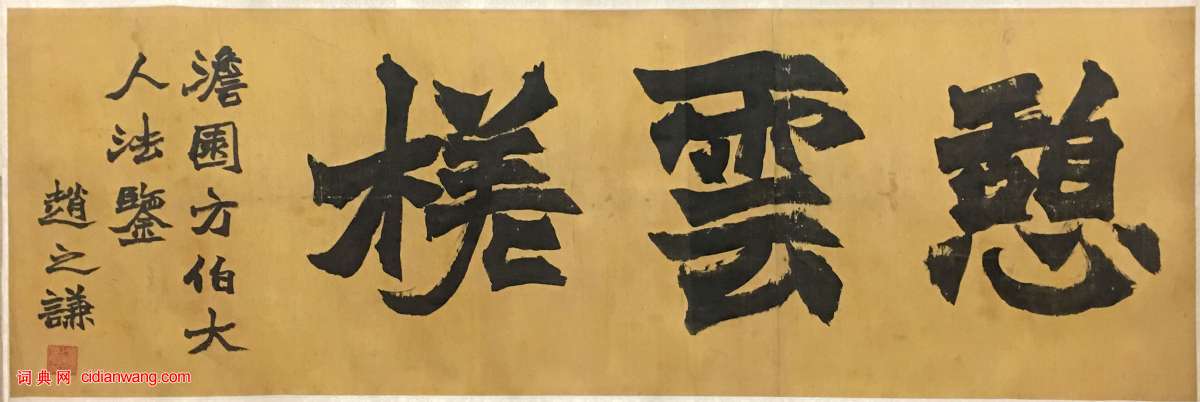 說明:此幅用魏碑楷書體書寫,“憩雲槎”三個大字厚重而靈動,筆力遒勁而秀美,筆划起收、稜角乾脆利落,功力深厚。趙之謙受到康有為等影響,崇尚碑學,書法自顏體改入魏碑,以穩重、勁健、靈動的魏碑書法馳名書壇,被人稱頌。