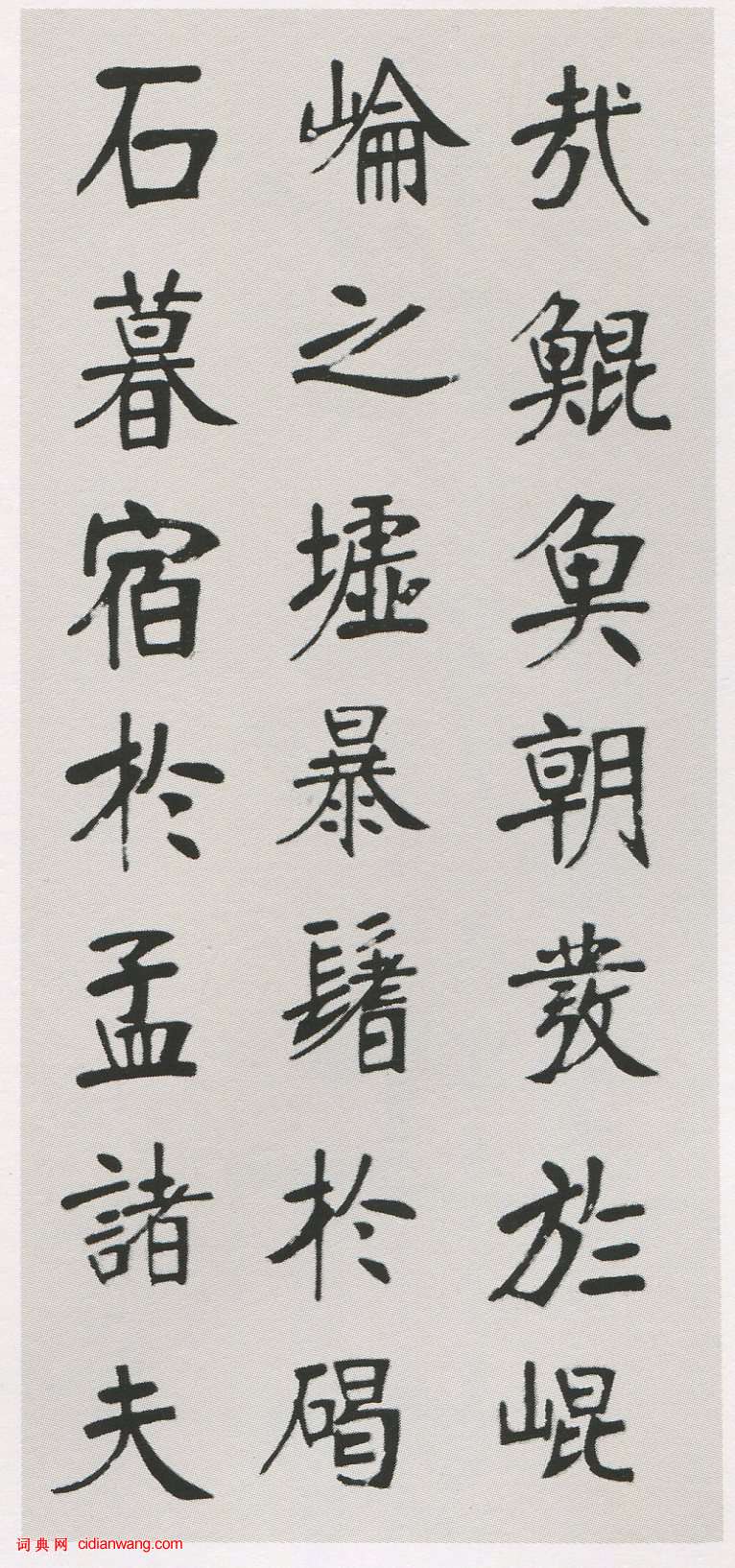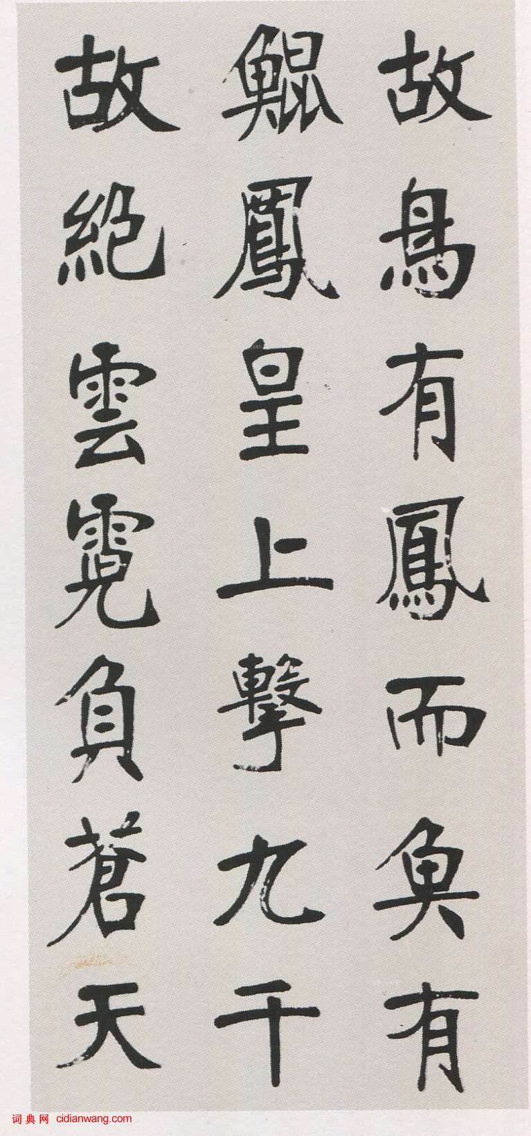 故鳥有鳳而魚有鯤。鳳皇上擊九千里,絕雲霓,負蒼天,足亂浮雲,翱翔乎杳冥之上。夫蕃籬之鷃,豈能與之料天地之高哉?鯤魚朝發崑崙之墟,暴鬐於碣石,暮宿於孟諸。夫尺澤之鯢,豈能與之量江海之大哉?(摘自宋玉《宋玉對楚王問》)作者:張裕釗 書體:楷書