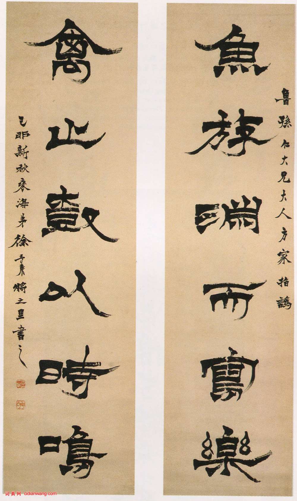 徐三庚《隸書魚游禽止六言聯》紙本 131.4×35.2cm×2 南京博物院藏