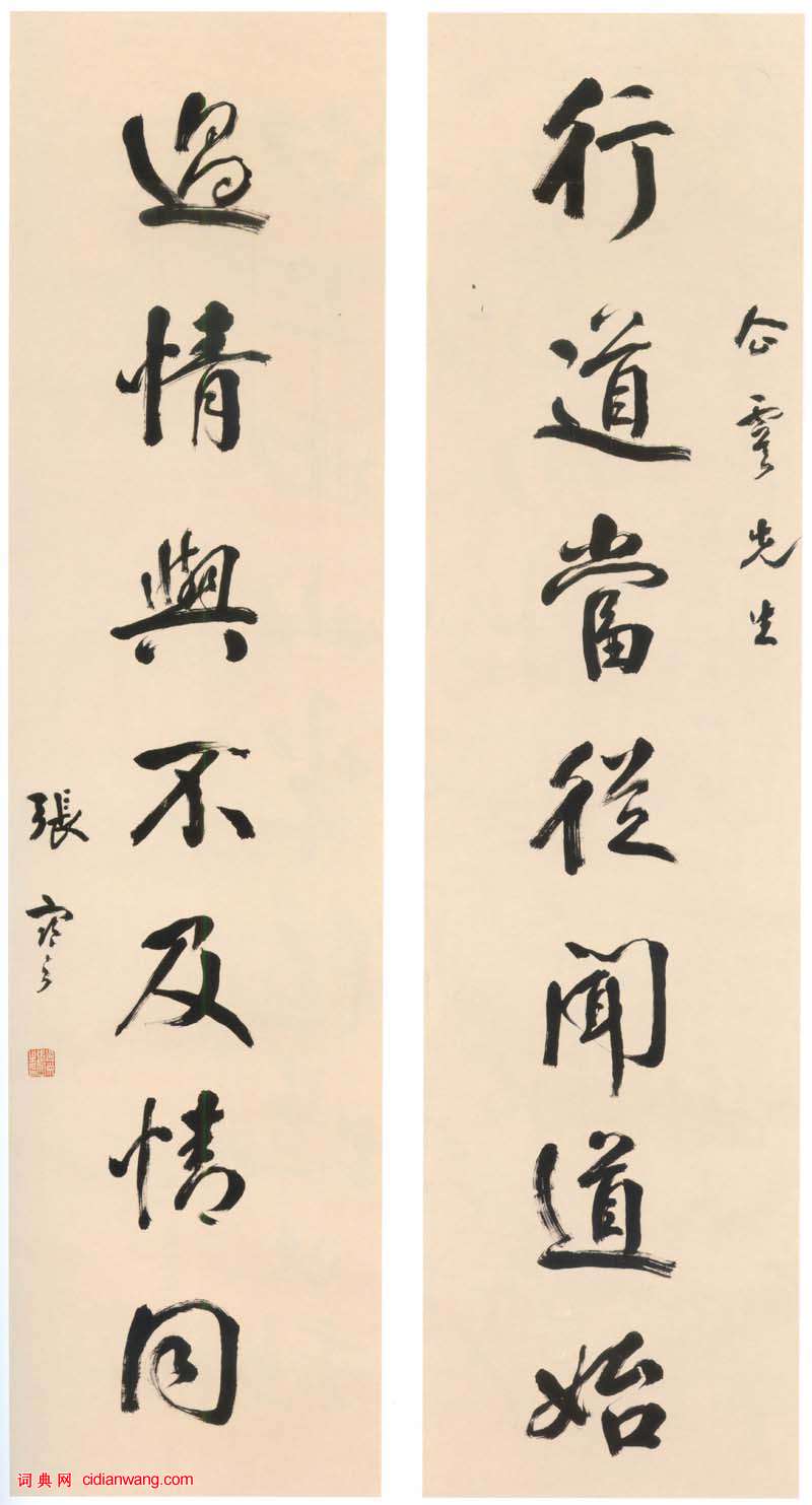書法欣賞魏晉書法唐朝書法宋朝書法元朝書法明朝書法清朝書法近現代書法字典網>> 歷代書法>> 清朝>> 張謇《行書行道過情七言聯》正文 張謇《行書行道過情七言聯》作者:張謇 書體:行書 張謇《行書行道過情七言聯》紙本行書 145×36.9cm×2 上海博物館藏釋文:行道當從聞道始,過情與不及情同。 款署:企虞先生,張謇。【資料來源】《中國法書全集》-18-清-3 (文物出版社 可嘉掃描)張謇的相關書法作品:張謇《行楷書更俗劇場聯》 張謇《行書行道過情七言聯》 相關文章:陳鴻壽·隸書六言聯 (隸書)結德言而為佩,援雅範以自綏。鐵舟《行書軸》 (行書)鐵舟《行書軸》紙本行書 127.9×50.3cm 上海博物館藏釋 文:與李振叔...翁同龢行書《掃地模山八言聯》 (行書)翁同龢《行書掃地模山八言聯》紙本行書 260.4×57.9cm×2 蘇州博物...楊峴《隸書四屏》 (隸書)楊峴《隸書四屏》133.0×33.0cm 美國弗利爾美術館藏 ...楊沂孫篆書《專己端慤八言聯》 (篆書)楊沂孫《篆書專己端慤八言聯》紙本篆書 172.5×34.4cm×2 北京故宮...南宋瓷印 難得一見景德鎮窯南宋青白瓷印研究講座本篇瓷印,展出了西泠印社理事、南京藝術學院教授黃惇收...歐陽詢書法結字36法這篇書論,就是唐代書法大家、楷法極則的創作者——歐陽詢總結出來的《書法結字三十六...趙孟頫·題《二羊圖》 (行書)【釋文】余嘗畫馬,未嘗畫羊。因仲信求畫,余故戲為寫生,雖不能逼近古人,頗於氣韻有...王鐸《行草詩稿墨跡十二頁》 (行草)釋文:京中望北山,蒼蒼得要領。每於僧舍中,延眺臻此境。人聲響已息,頗爾眾慮屏。禪...王鐸行書《喜與友人聯艇之作》 (行書)王鐸《喜與友人聯艇之作》 立軸 憨齋吳南生原藏 釋文:乘橈殊不慍,目注...