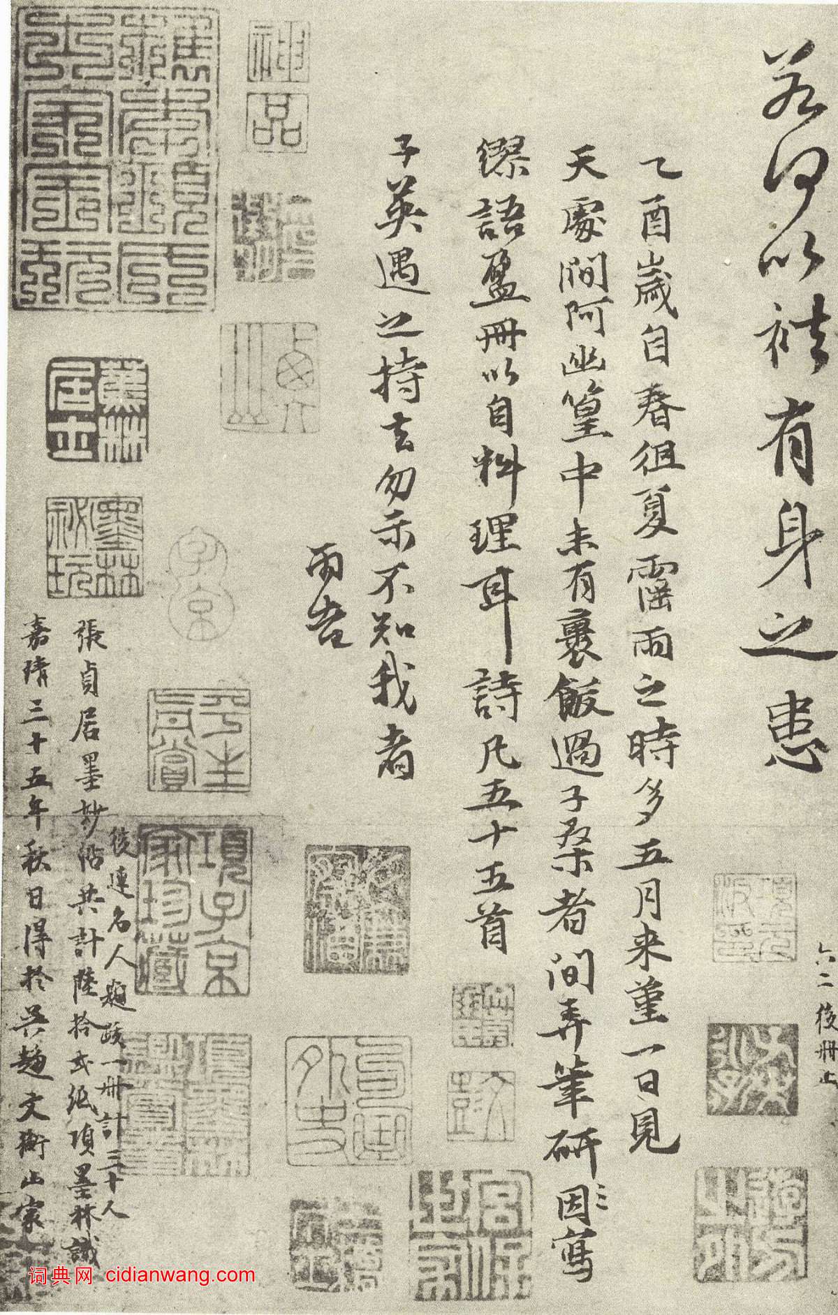 全冊共六十二頁,原裝為前後二冊,後連名人題跋一冊,計三十人。此詩冊今已分散,上海博物館收藏二十四頁, 瀚海2011秋拍現另外六頁,其餘下落不明,據當時拍賣價一頁約300萬 。