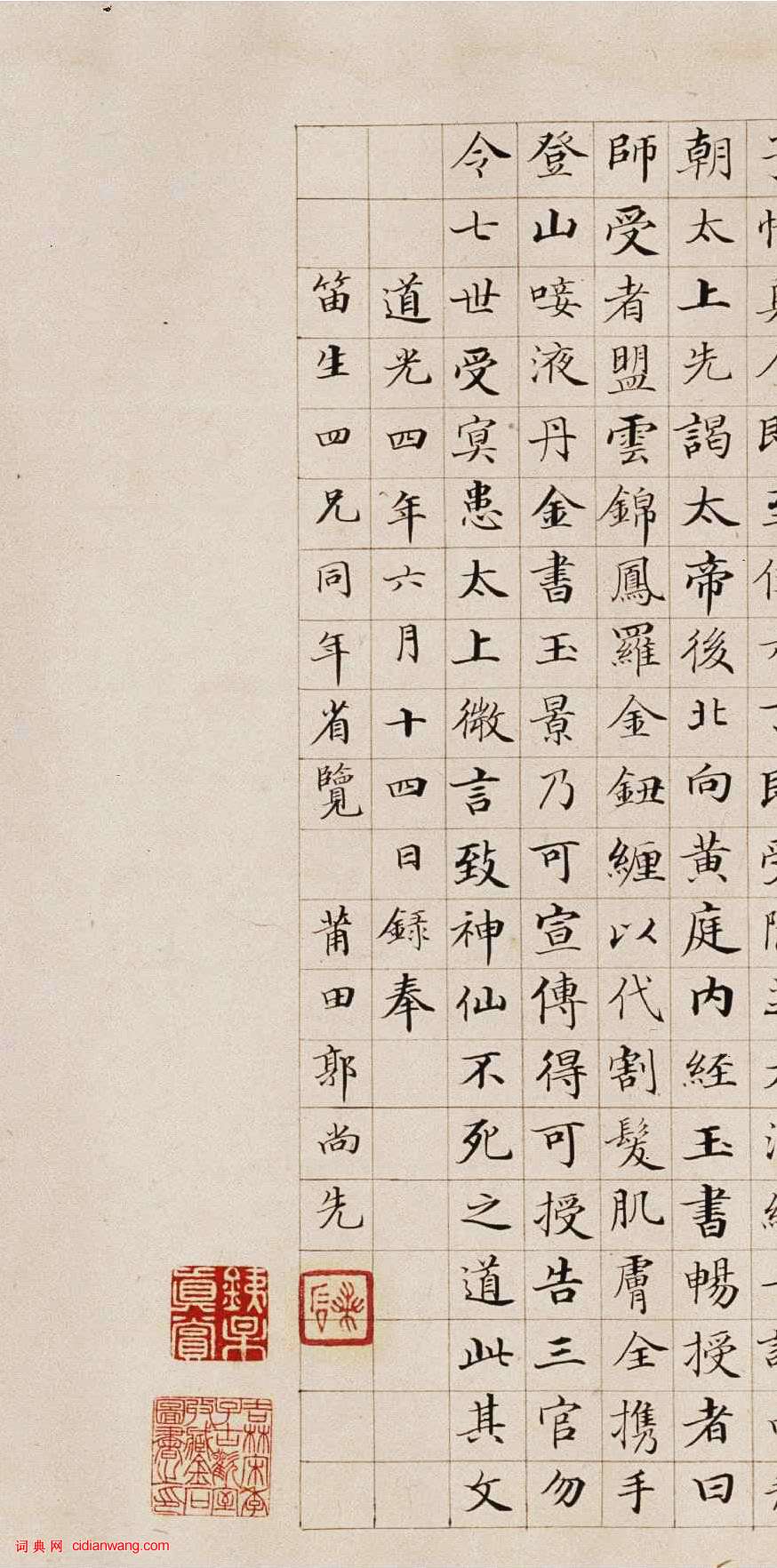 書法欣賞魏晉書法唐朝書法宋朝書法元朝書法明朝書法清朝書法近現代書法字典網>> 歷代書法>> 清朝>> 郭尚先《楷書黃庭內景經卷》(8)正文 郭尚先《楷書黃庭內景經卷》(8)作者:郭尚先 書體:楷書 首 頁 上一頁 1 2 3 4 5 6 7 8 郭尚先的相關書法作品:郭尚先《楷書黃庭內景經卷》 郭尚先《行書橫幅》 相關文章:王羲之·十七帖 (草書)釋文:十七日先書郗司馬未去 即日得足下書為慰先書以 具示複數字吾前東粗足作佳觀吾...老北京胡同里的對聯,書法了得老北京胡同里的對聯,書法了得!這些對聯,與北京文化一起,成為了一道古雅的風景線。...梁漱溟行書《錄林宰平詩一首》 (行書)梁漱溟《錄林宰平詩一首》行書 釋文: 安得胸如海樣寬,瞭然人事著悲歡。水天極...趙孟頫的手札欣賞 (行書)在趙孟頫傳世的諸多作品中,我最喜歡的,不是他的碑記或題跋,不是他抄的千字文,也不...蔡京·雪江歸棹圖卷跋 (行書)蔡京《雪江歸棹圖卷跋》,行書,北京故宮博物院藏。《雪江歸棹圖卷》為趙佶即宋徽宗繪...長沙窯詩文壺《日紅衫子合羅裙》詩文枕 (行書)青釉褐彩獅座“日紅衫子合羅裙”詩文枕 高7.3厘米 長13厘米 寬8.1厘米 湖...陳基行草《寢喜帖》 (行書)陳基《寢喜帖》紙本 行草 26.8×22.7厘米 北京故宮博物院藏陳基以詩聞名...南宋瓷印 難得一見景德鎮窯南宋青白瓷印研究講座本篇瓷印,展出了西泠印社理事、南京藝術學院教授黃惇收...張宇初·跋《宋拓黃庭經》 (楷書)【釋文】右黃庭經一帖。嘗聞之前輩在元盛時吾山所藏。迨八十餘本。於中此本最為精善。...錢杜《行書八言聯》 (行書)錢杜《行書八言聯》紙本行書 128.9×20.3cm×2 上海博物館藏釋 文...