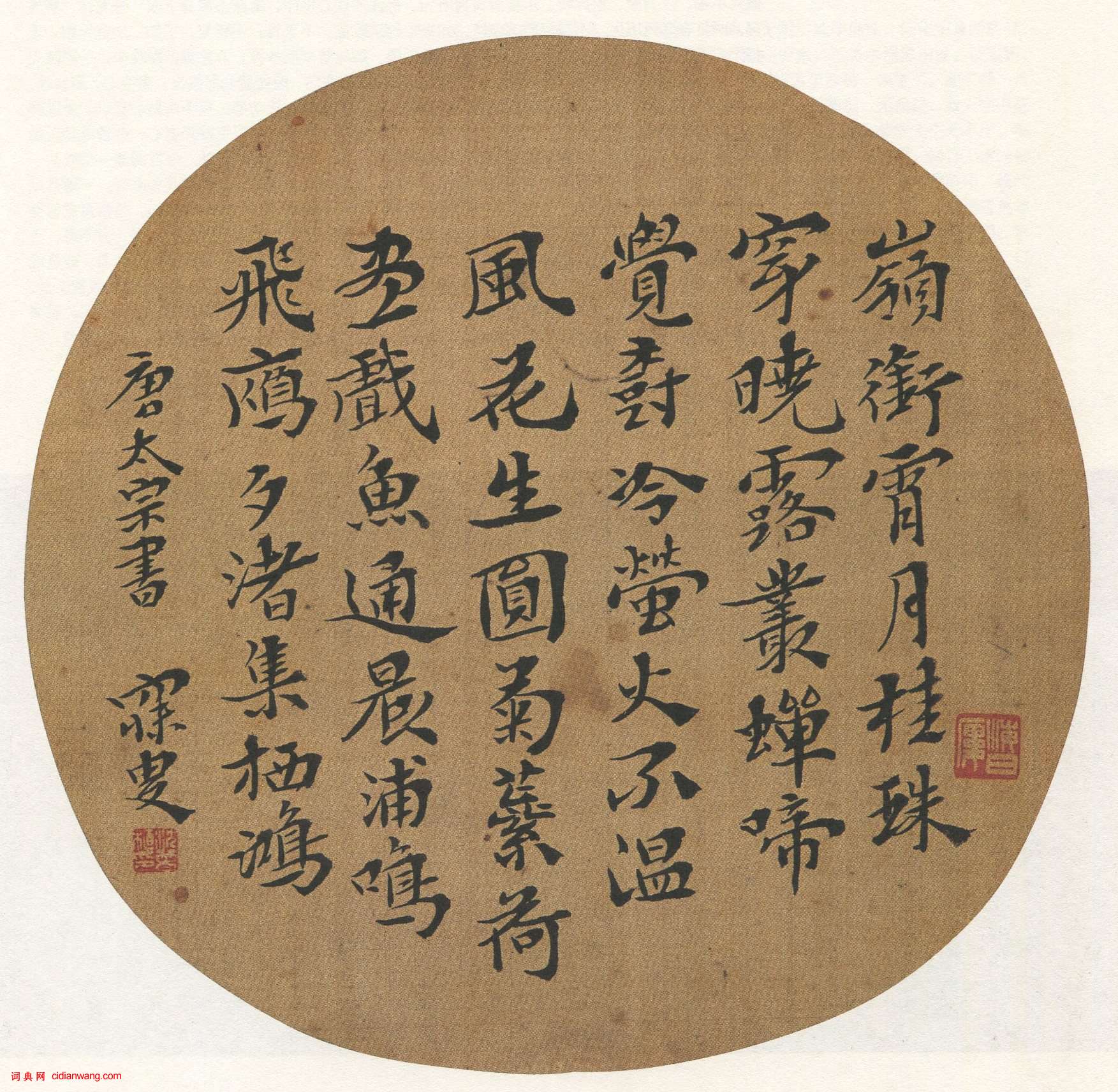 釋文:嶺銜霄月桂,珠穿曉露叢。蟬啼覺樹冷,螢火不溫風。花生圓菊蕊,荷盡戲魚通。晨浦鳴飛雁,夕渚集棲鴻。