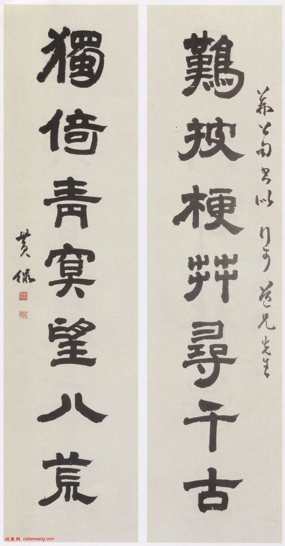 書法欣賞魏晉書法唐朝書法宋朝書法元朝書法明朝書法清朝書法近現代書法字典網>> 歷代書法>> 清朝>> 黃侃《隸書難披獨倚七言聯》正文 黃侃《隸書難披獨倚七言聯》作者:黃侃 書體:隸書 黃侃《隸書難披獨倚七言聯》 湖北省博物館藏 釋文:難披梗莽尋千古,獨倚青冥望八荒。 款署:荊公句,書似行可道兄先生。黃侃。 鈐印:黃侃季剛(白文)、亦陶(朱文) 【資料來源】《書畫藝術》雜誌2013年第一期 黃侃的相關書法作品:黃侃《篆書橫披》 黃侃《小楷跋翁方綱行書軸》 黃侃《行書黃庭堅花氣熏人詩軸》 黃侃《篆書陽明手跡橫披》 黃侃《篆書日守天留七言聯》 黃侃《篆書錄朱熹詩扇》 黃侃《行書差可具令六言聯》 黃侃《行書硬黃飛白七言聯》 黃侃《隸書鶯啼序 》 相關文章:宋克·孫過庭書譜冊 (行書)宋克章草《孫過庭書譜冊》,美國普林斯頓大學附屬圖書館藏。是贈送給他的好友俞孟京的...曾國藩行書《剛正翔實橫幅》 (行書)曾國藩《行書“剛正翔實”橫幅》 湖南省博物館藏釋文:剛正翔實 款識:遷史書詳實作...黃庭堅·跋李公麟《五馬圖卷》 (行書)黃庭堅跋李公麟《五馬圖卷》,行書。釋文:余嘗評伯時人物似南朝諸謝中有邊幅者。然朝...董其昌·草書張籍七言詩 (草書)【釋文】水北原南野草新,雪消風暖不生塵。城中車馬知無數,能解閒行有幾人。其昌。董...徐枋《草書七律詩軸》 (草書)徐枋《草書七律詩軸》 151×69.6cm 蘇州博物館藏 釋文:綠波浩浩浣花溪...什麼是永字八法一、點為側(如鳥之翻然側下)側是傾斜不正之意,點應取傾斜之勢,如巨石側立,險勁而...虛谷《行書六言聯》 (行書)虛谷《行書六言聯》紙本行書 132×28.7cm×2 上海博物館藏釋 文:雪...乾隆御筆《斗鹿賦》 (行書)乾隆在《斗鹿賦》中體現出三個重要的文學價值:一是體現出乾隆聖心天眷的仁義之心;二...陳繹曾小楷《靜春先生詩集後序》 (小楷)陳繹曾《靜春先生詩集後序》紙本,31.2X49.5厘米,北京故宮博物院藏。 靜春...北魏《一弗為張元祖造像記》 (楷書)一弗為張元祖造像記拓片 《龍門二十品》的第二品《一弗為張元祖造像記》(簡稱《一弗...